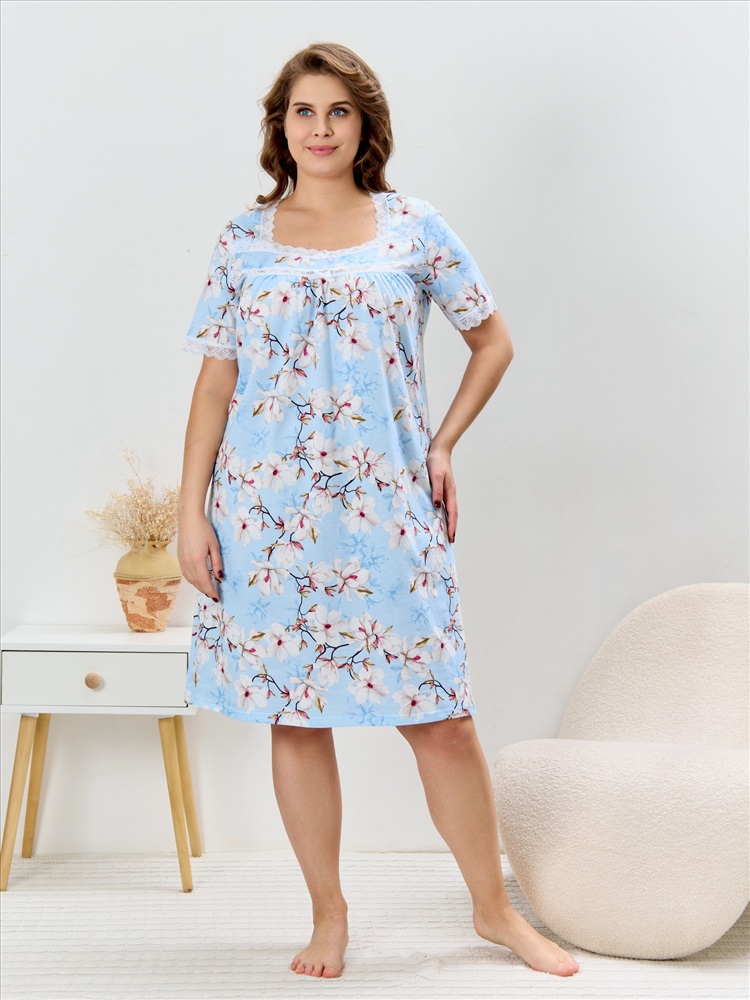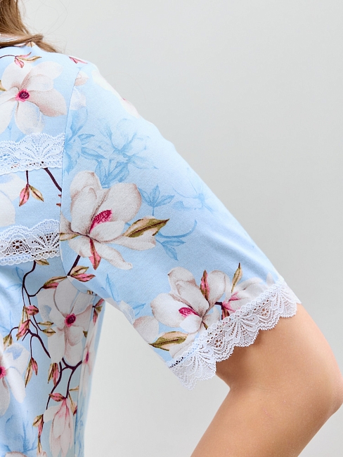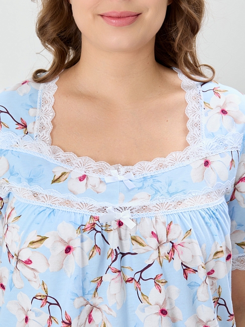 Сорочка женская из трикотажного полотна «кулирка» с набивным рисунком, свободного покроя, расширенная книзу, с короткими втачными рукавами и горловиной фигурной формы. Полочка – с притачной кокеткой V-образной формы, состоящей из двух частей. Нижняя, основная деталь полочки присборена по шву стачивания с кокеткой. Низ рукавов, горловина и кокетка отделаны кружевом. В центре кокетки – два декоративных бантика из узкой атласной ленты.