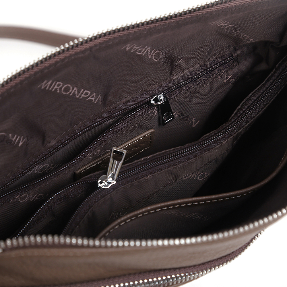 Женская сумка-хобо MIRONPAN вместительна и практична. Модель в цвете корица выполнена из натуральной зернистой кожи и отличается лаконичным дизайном. Сумка закрывается на молнию с металлическим поводком. Внутри 3 боковых кармана для мелочей: одно открытое и два на молнии. Лицевая сторона декорирована ассиметричным, вместительным карманом. На тыльной стороне предусмотрен карман быстрого доступа на молнии. Удобный ремень шириной 2,5 см , дополненный цепочкой с крупными звеньями, гармонично вписан в дизайн изделия и позволяет комфортно носить аксессуар на плече и в руке, второй плечевой ремень регулируется по длине, ширина - 1,5 см, Цвет фурнитуры - серебро.