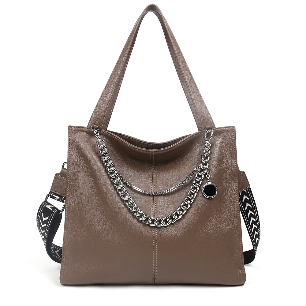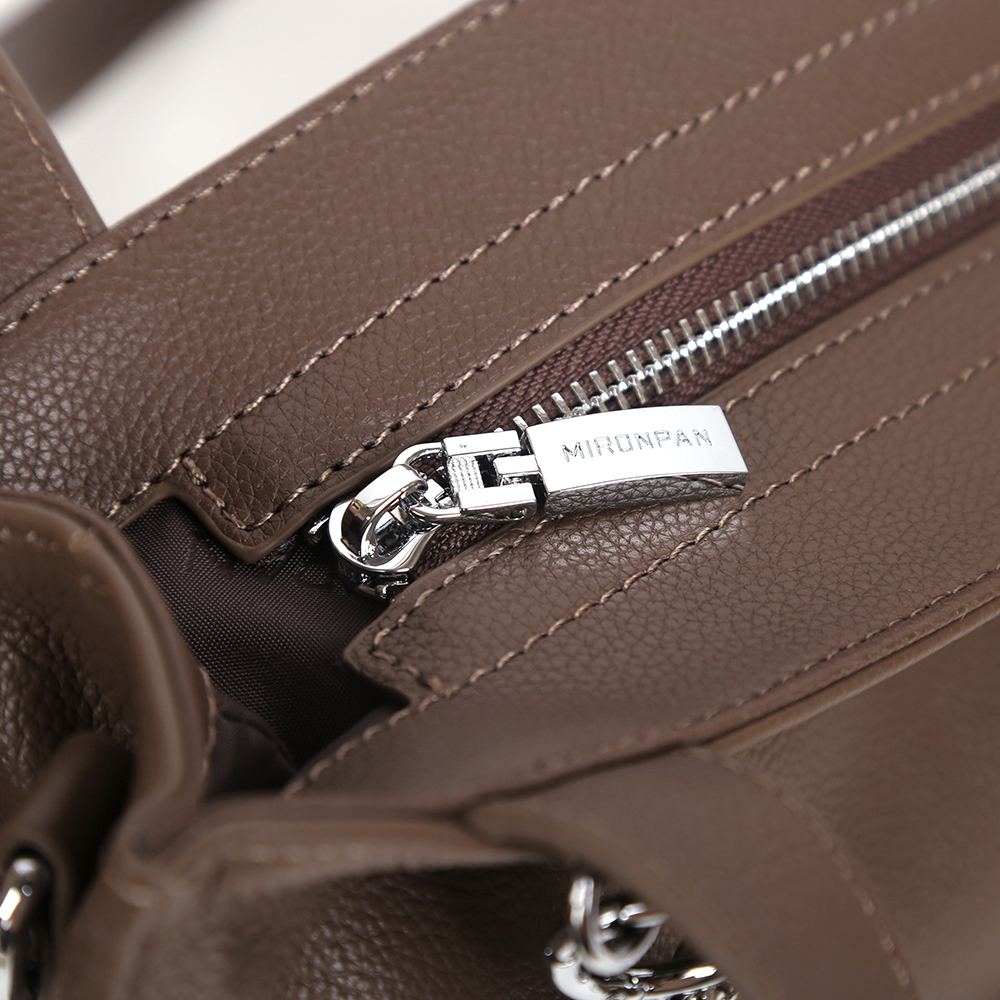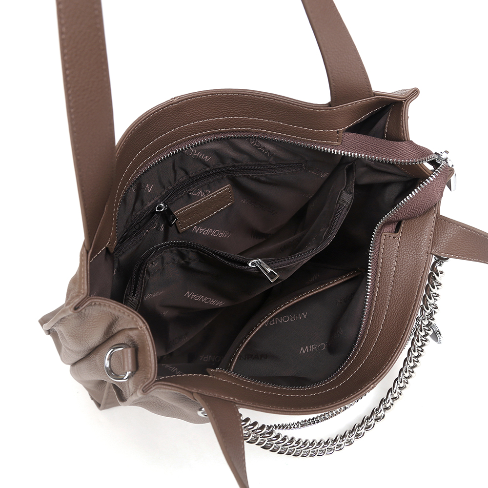 Сумка-тоут MIRONPAN в цвете корица выполнена из натуральной зернистой кожи. Закрывается на молнию с металлическим поводком. Внутри 3 кармана для мелочей: одно открытое и два на молнии. На тыльной стороне предусмотрен карман быстрого доступа на молнии. В качестве декора выступает съемная цепочка со средними звеньями . Удлиненные плотные ручки позволяют комфортно носить аксессуар на плече. Модель не вмещает формат А4. Цвет фурнитуры - серебро