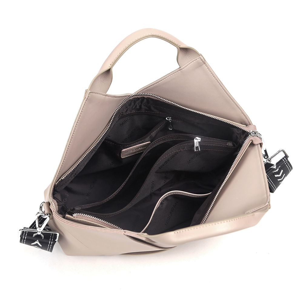 Стильная сумка-тоут MIRONPAN в бежевом цвете выполнена из натуральной гладкой кожи и на лицевой стороне декорирована эффектным плетением. Сумка имеет жесткий каркас и закрывается на молнию с металлическим поводком. Внутри 2 отдела, разделенных средником с карманом на молнии. На внутренних боковых стенках есть 3 кармана для мелочей: 2 открытых и на молнии. На тыльной стороне предусмотрен карман быстрого доступа на молнии. Дно сумки защищают 4 металлические ножки. Две ручки позволяют комфортно носить аксессуар в руке. В комплекте идут два съемный плечевых ремня : кожаный (ширина - 3 см), текстильный -регулируется по длине ( ширина - 5 см). Модель не вмещает формат А4.