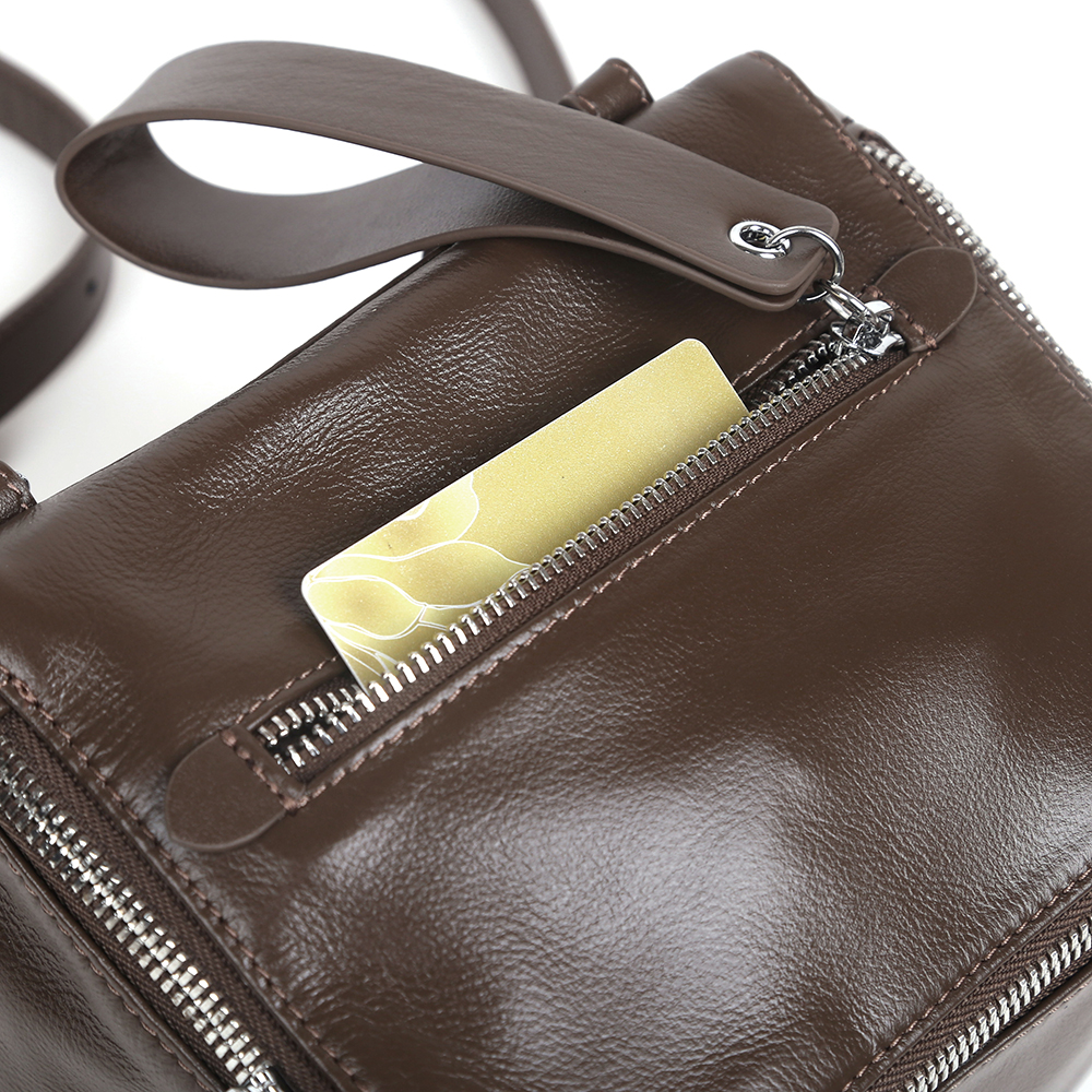 Оригинальная кросс-боди MIRONPAN в коричневый цвете выполнена из натуральной гладкой кожи с блестящей лаковой поверхностью. Сумка закрывается на полукруглую молнию с двумя металлическими поводками. Сверху есть ручка-цепочка, позволяющая комфортно носить изделие в руке. Внутри 3 боковых кармана для мелочей: открытый и два на молнии. На лицевой стороне карман быстрого доступа закрывается на молнию с оригинальным кожаным поводком. С тыльной стороны так же есть карман быстрого доступа на молнии. .Съемный плечевой ремень регулируется по длине, ширина - 2,5 см.