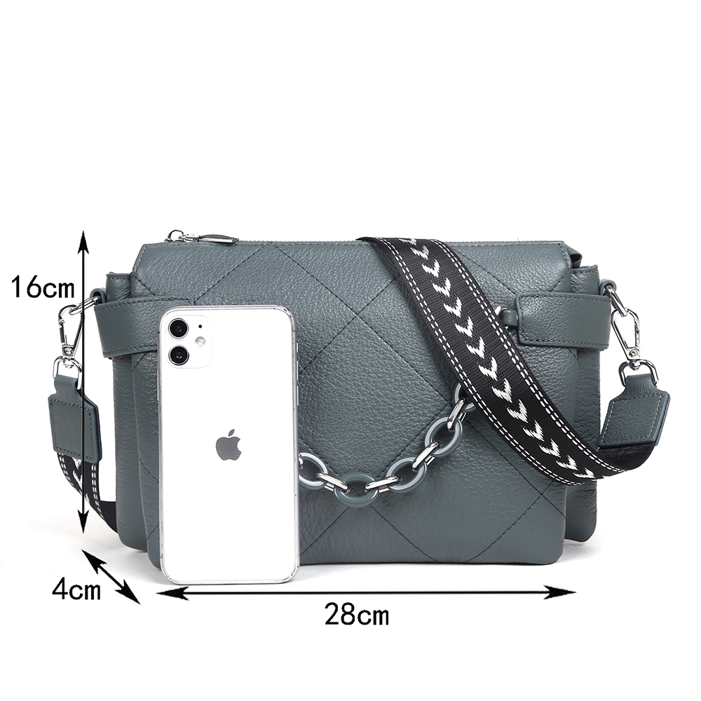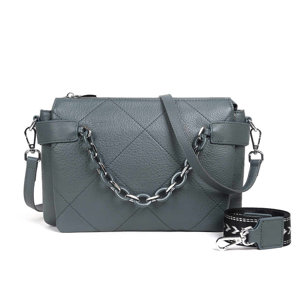 Удобная сумка кросс-боди MIRONPAN выполнена из натуральной зернистой кожи в бирюзовом оттенке. Модель отличает лаконичный дизайн и продуманная система хранения. Основное отделение закрывается на молнию. Внутри - 3 отсека, разделенных перегородками, и 2 боковых кармана - открытый и на молнии. Лицевая сторона декорирована геометрической стежкой и цепочкой со средними звеньями. На тыльной стороне предусмотрен карман быстрого
