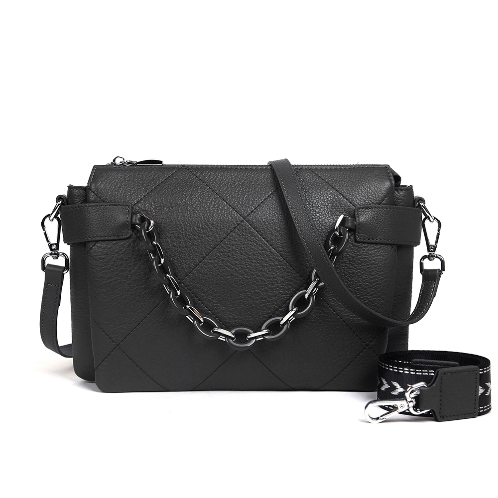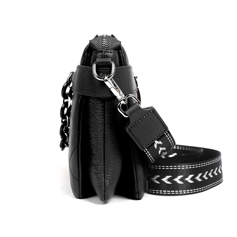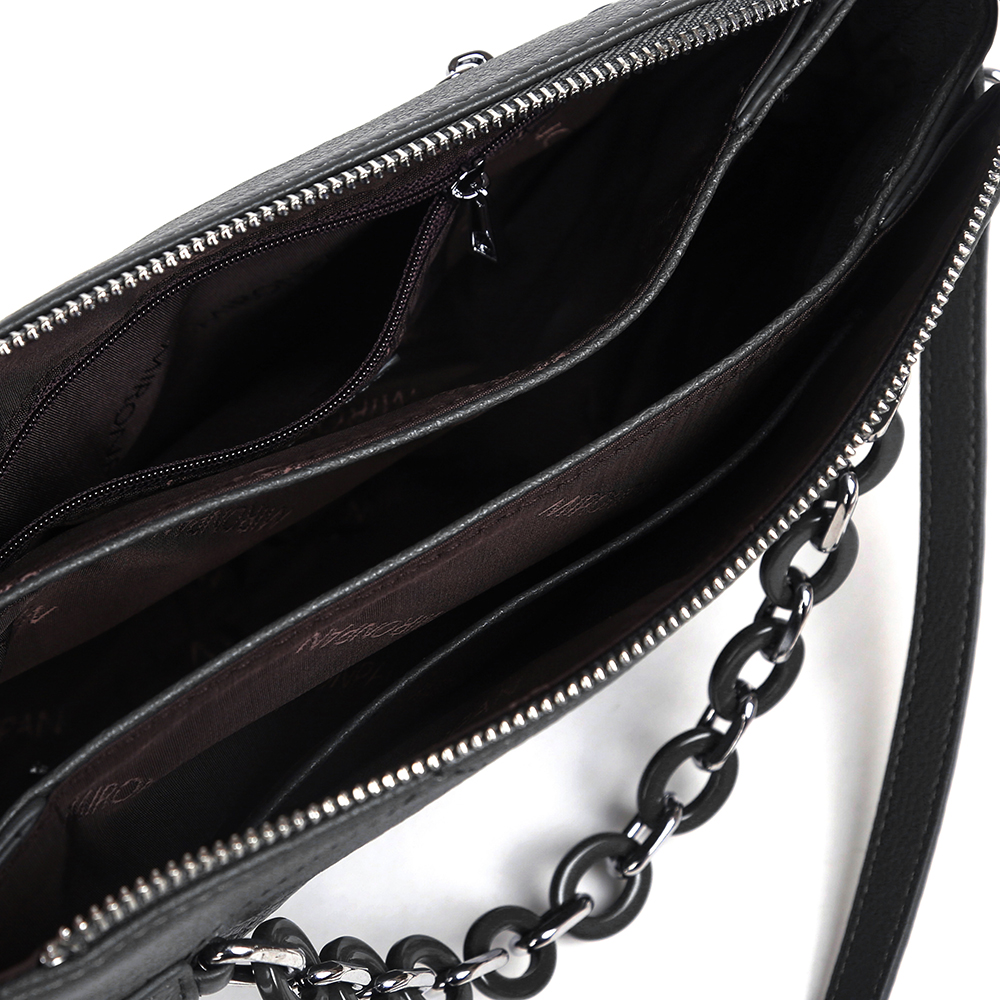Удобная сумка кросс-боди MIRONPAN выполнена из натуральной зернистой кожи в черном оттенке. Модель отличает лаконичный дизайн и продуманная система хранения. Основное отделение закрывается на молнию. Внутри - 3 отсека, разделенных перегородками, и 2 боковых кармана - открытый и на молнии. Лицевая сторона декорирована геометрической стежкой и цепочкой со средними звеньями. На тыльной стороне предусмотрен карман быстрого