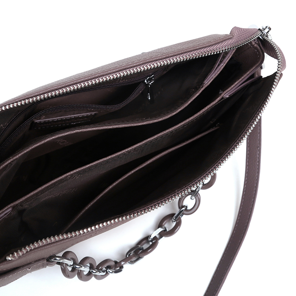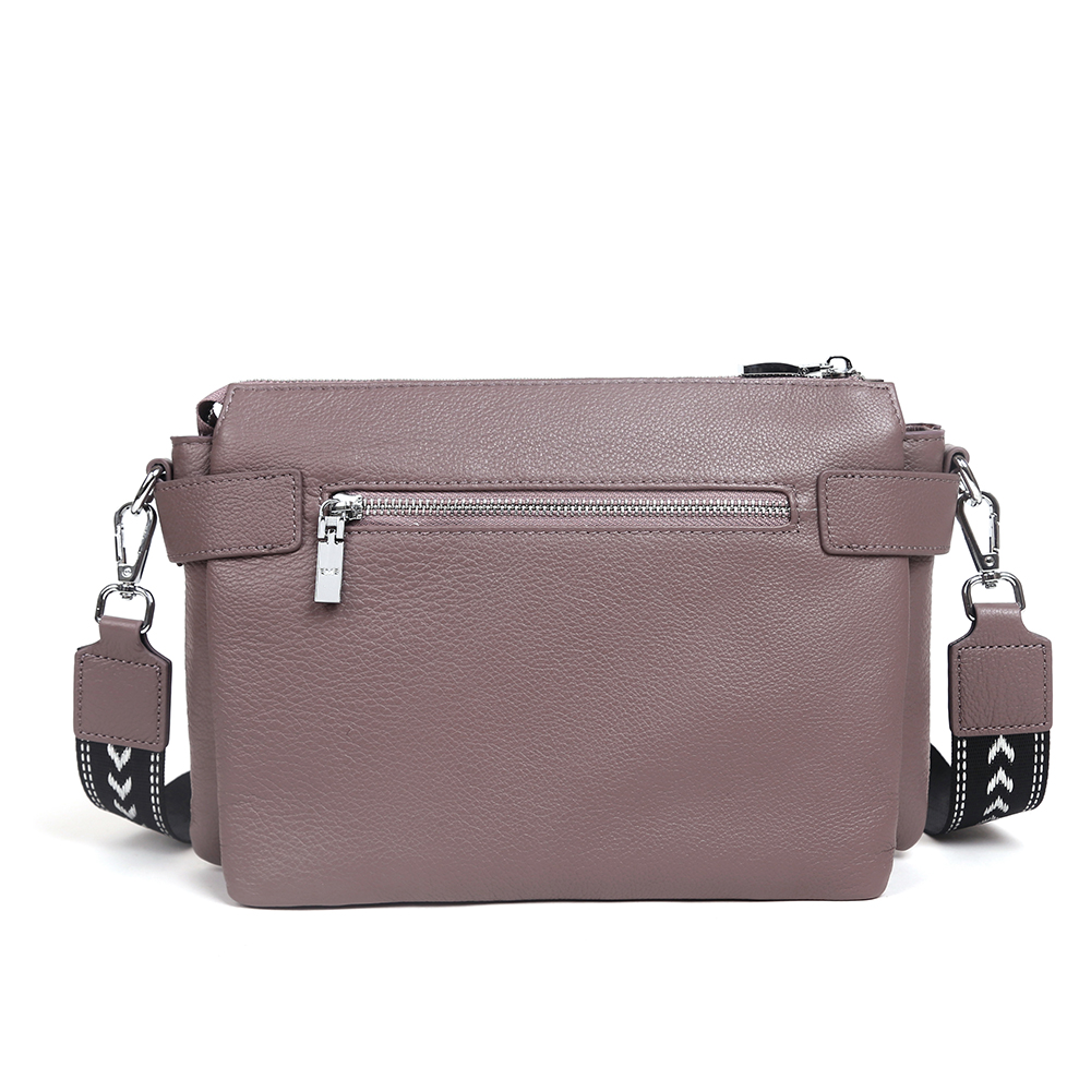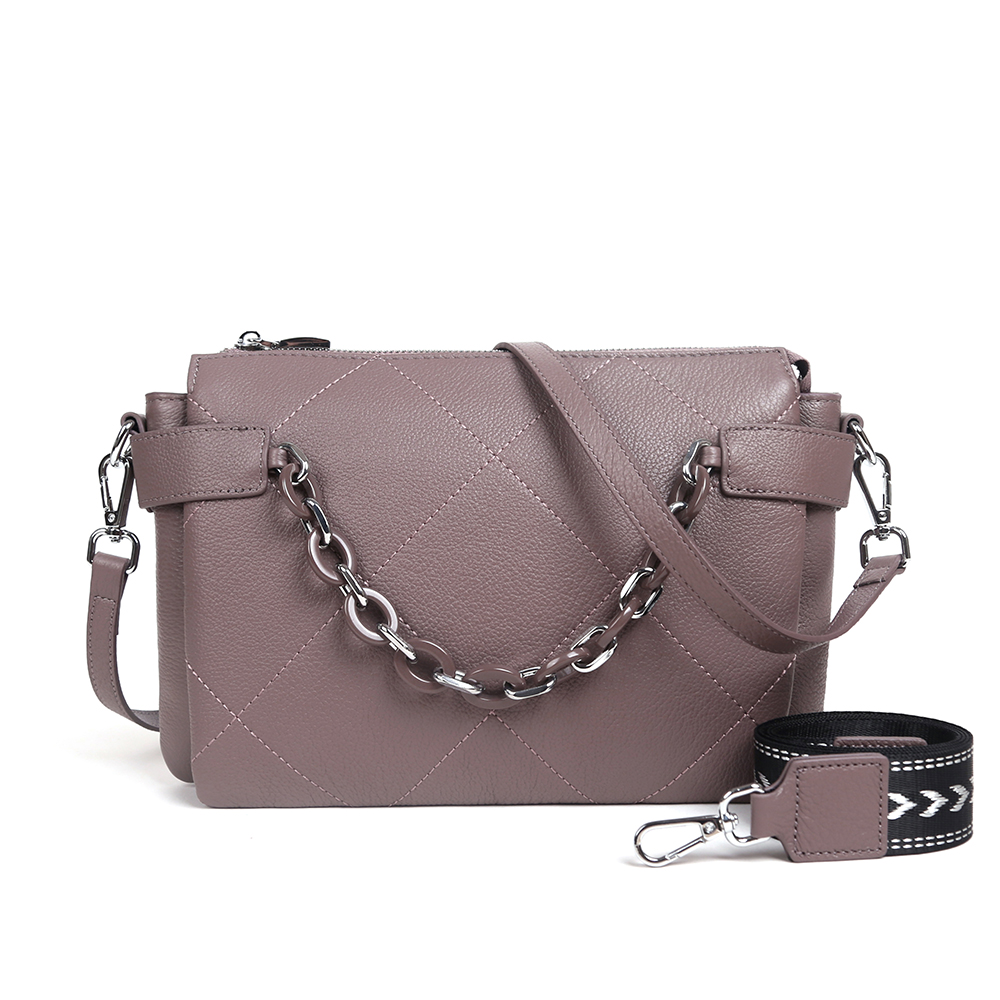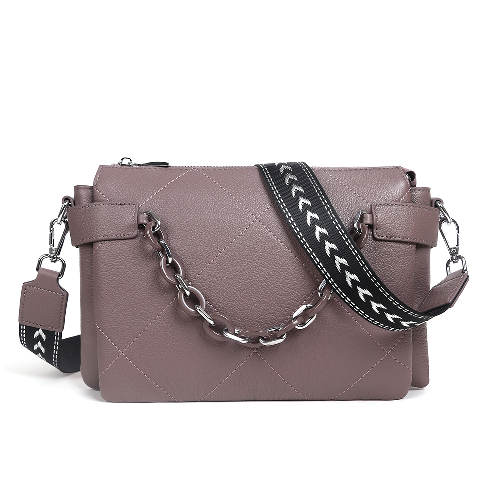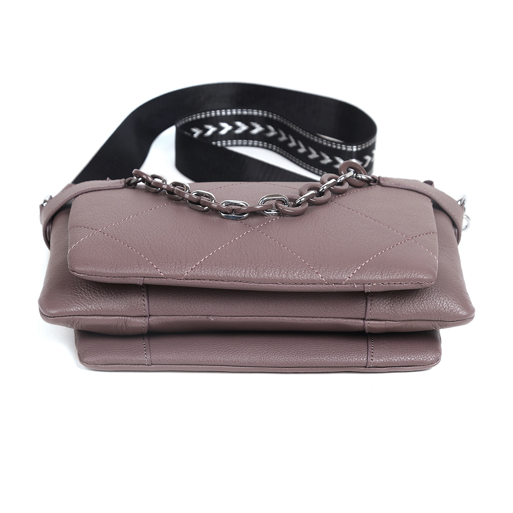 Удобная сумка кросс-боди MIRONPAN выполнена из натуральной зернистой кожи в светло-сиреневом оттенке. Модель отличает лаконичный дизайн и продуманная система хранения. Основное отделение закрывается на молнию. Внутри - 3 отсека, разделенных перегородками, и 2 боковых кармана - открытый и на молнии. Лицевая сторона декорирована геометрической стежкой и цепочкой со средними звеньями. На тыльной стороне предусмотрен карман быстрого