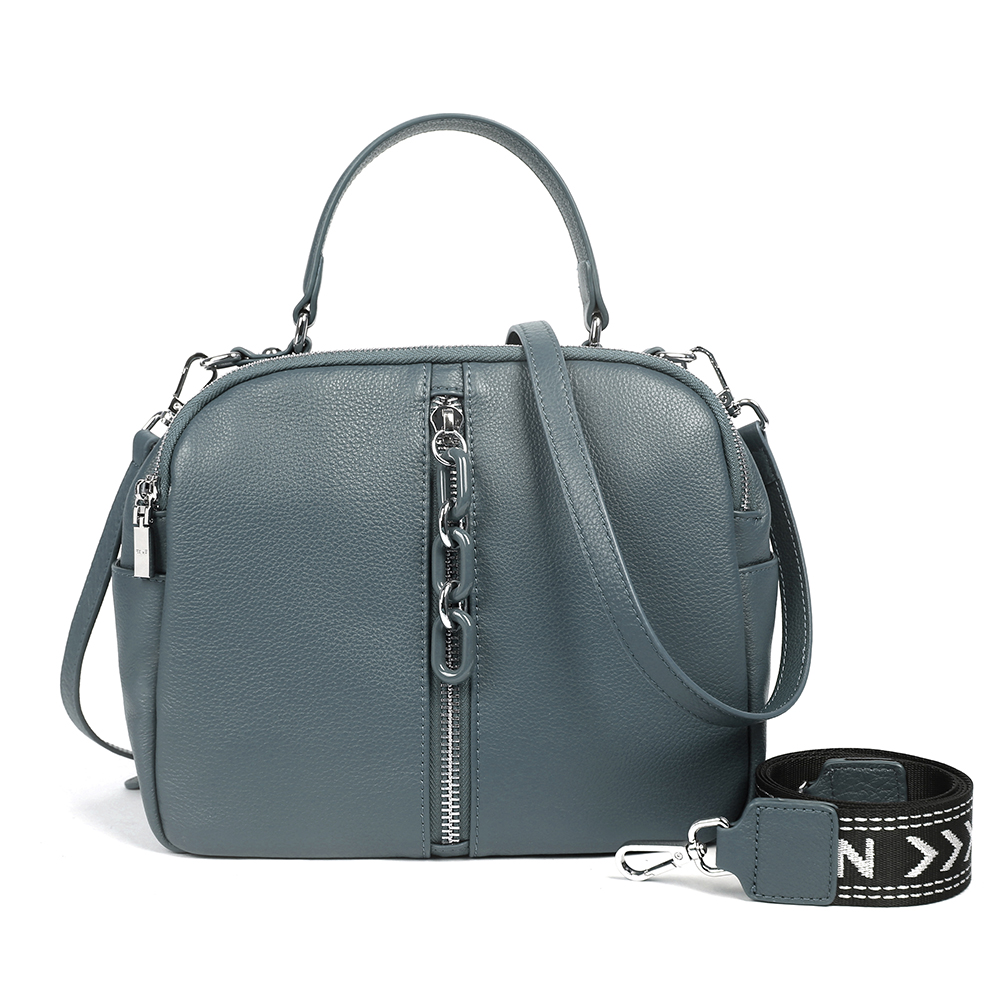 Вместительная сумка MIRONPAN в бирюзовом оттенке выполнена из натуральной зернистой кожи. В сумке 2 отделения, каждое из которых закрывается на полукруглую молнию. Внутри одного отделения есть боковой карман для мелочей на молнии, внутри другого - 2 открытых кармана. Лицевая сторона декорирована молнией с поводком "цепочка". На тыльной стороне предусмотрен карман быстрого доступа на молнии. Дно сумки защищают 4 металлические ножки. Одна ручки позволяют комфортно носить аксессуар в руке , в комплект идут два ремня кожаный 1,5 см и тканевый 3,5см . Модель не вмещает формат А4.