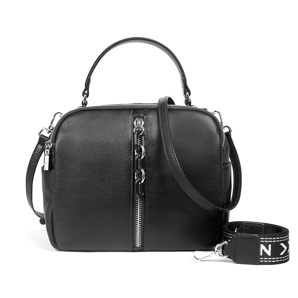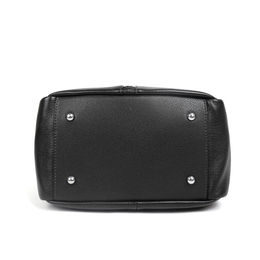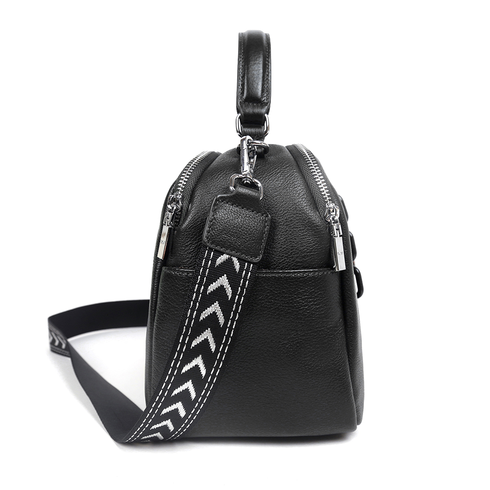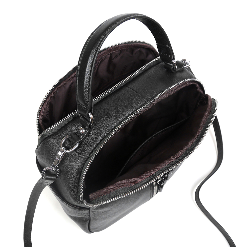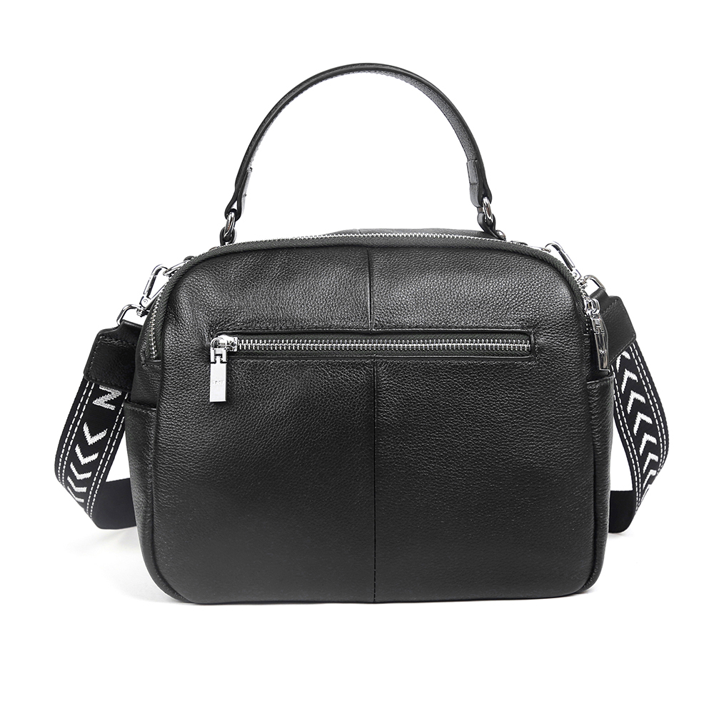 Вместительная сумка MIRONPAN в черном оттенке выполнена из натуральной зернистой кожи. В сумке 2 отделения, каждое из которых закрывается на полукруглую молнию. Внутри одного отделения есть боковой карман для мелочей на молнии, внутри другого - 2 открытых кармана. Лицевая сторона декорирована молнией с поводком цепочка. На тыльной стороне предусмотрен карман быстрого доступа на молнии. Дно сумки защищают 4 металлические ножки. Одна ручки позволяют комфортно носить аксессуар в руке , в комплект идут два ремня кожаный 1,5 см и тканевый 3,5см . Модель не вмещает формат А4.