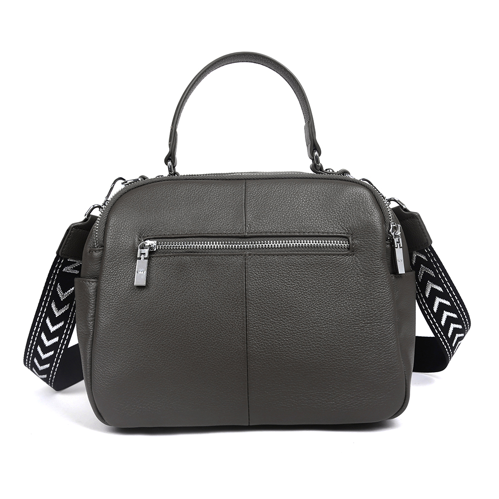 Вместительная сумка MIRONPAN в цвете графит выполнена из натуральной зернистой кожи. В сумке 2 отделения, каждое из которых закрывается на полукруглую молнию. Внутри одного отделения есть боковой карман для мелочей на молнии, внутри другого - 2 открытых кармана. Лицевая сторона декорирована молнией с поводком цепочка. На тыльной стороне предусмотрен карман быстрого доступа на молнии. Дно сумки защищают 4 металлические ножки. Одна ручки позволяют комфортно носить аксессуар в руке , в комплект идут два ремня кожаный 1,5 см и тканевый 3,5см . Модель не вмещает формат А4.