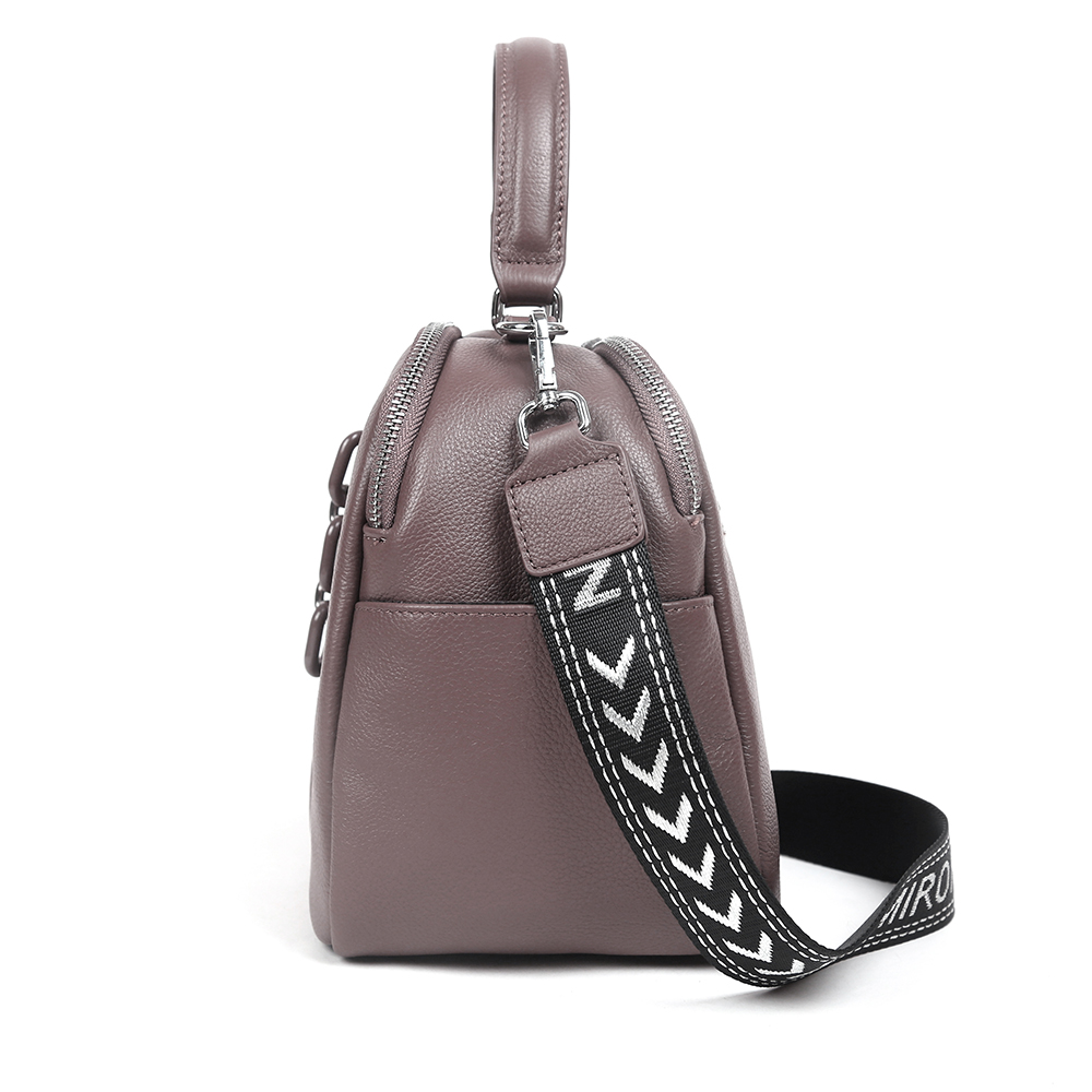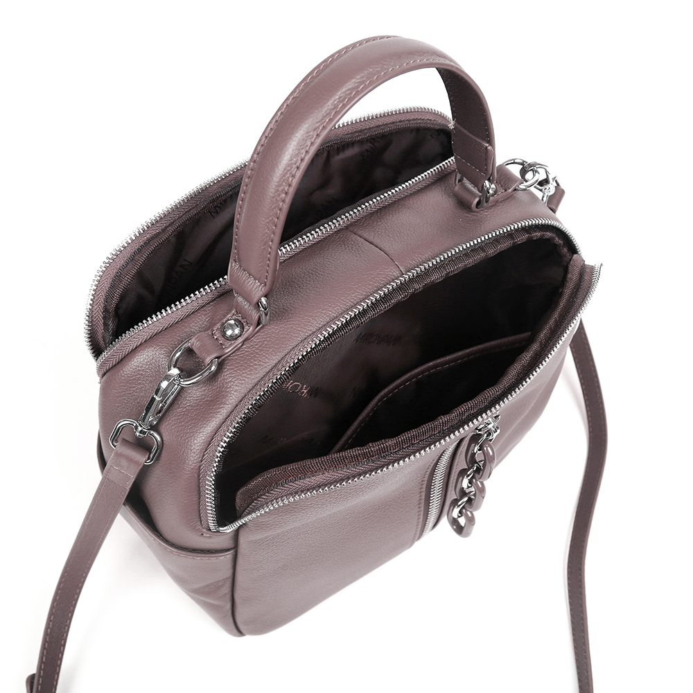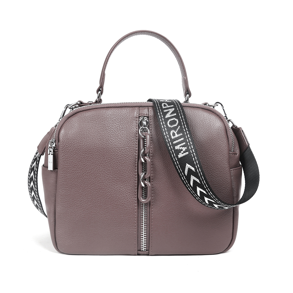 Вместительная сумка MIRONPAN в светло- сиреневом оттенке выполнена из натуральной зернистой кожи. В сумке 2 отделения, каждое из которых закрывается на полукруглую молнию. Внутри одного отделения есть боковой карман для мелочей на молнии, внутри другого - 2 открытых кармана. Лицевая сторона декорирована молнией с поводком цепочка. На тыльной стороне предусмотрен карман быстрого доступа на молнии. Дно сумки защищают 4 металлические ножки. Одна ручки позволяют комфортно носить аксессуар в руке , в комплект идут два ремня кожаный 1,5 см и тканевый 3,5см . Модель не вмещает формат А4.