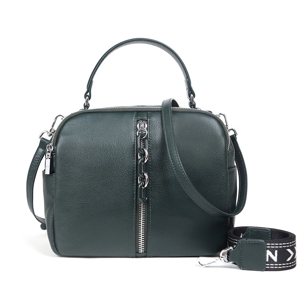 Вместительная сумка MIRONPAN в темно-зеленом цвете выполнена из натуральной зернистой кожи. В сумке 2 отделения, каждое из которых закрывается на полукруглую молнию. Внутри одного отделения есть боковой карман для мелочей на молнии, внутри другого - 2 открытых кармана. Лицевая сторона декорирована молнией с поводком цепочка. На тыльной стороне предусмотрен карман быстрого доступа на молнии. Дно сумки защищают 4 металлические ножки. Одна ручки позволяют комфортно носить аксессуар в руке , в комплект идут два ремня кожаный 1,5 см и тканевый 3,5см . Модель не вмещает формат А4.