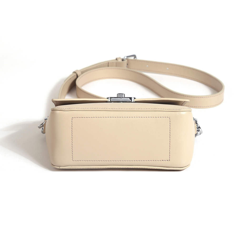 Габариты: 20 х 13 х 9 (длина х высота х ширина); Материал: Кожа; Размер: Маленький; Цвет: Молочный; Цвет фурнитуры: Серебряный