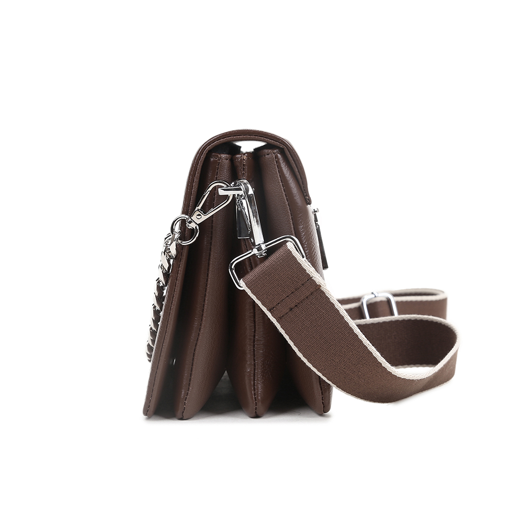 ремня модель легко трансформируется в клатч. Оригинально декорирована серебристой