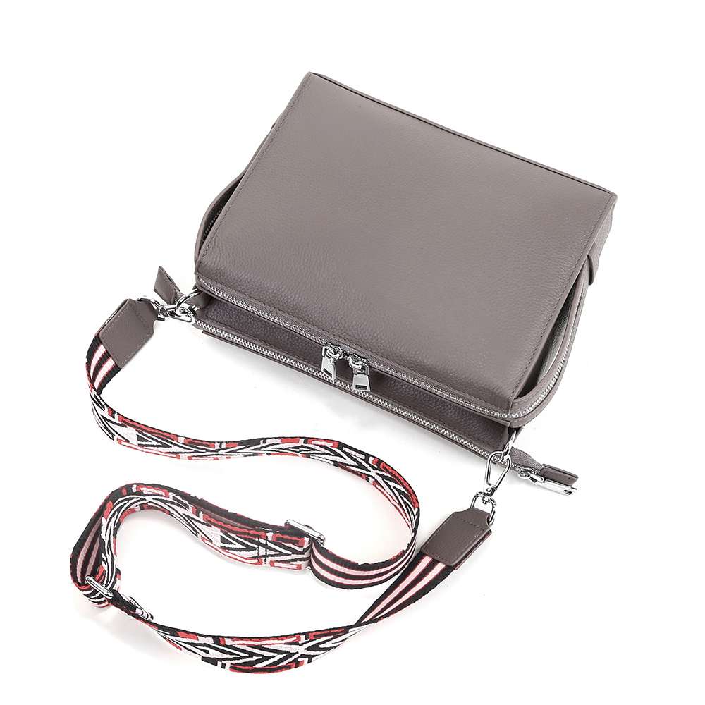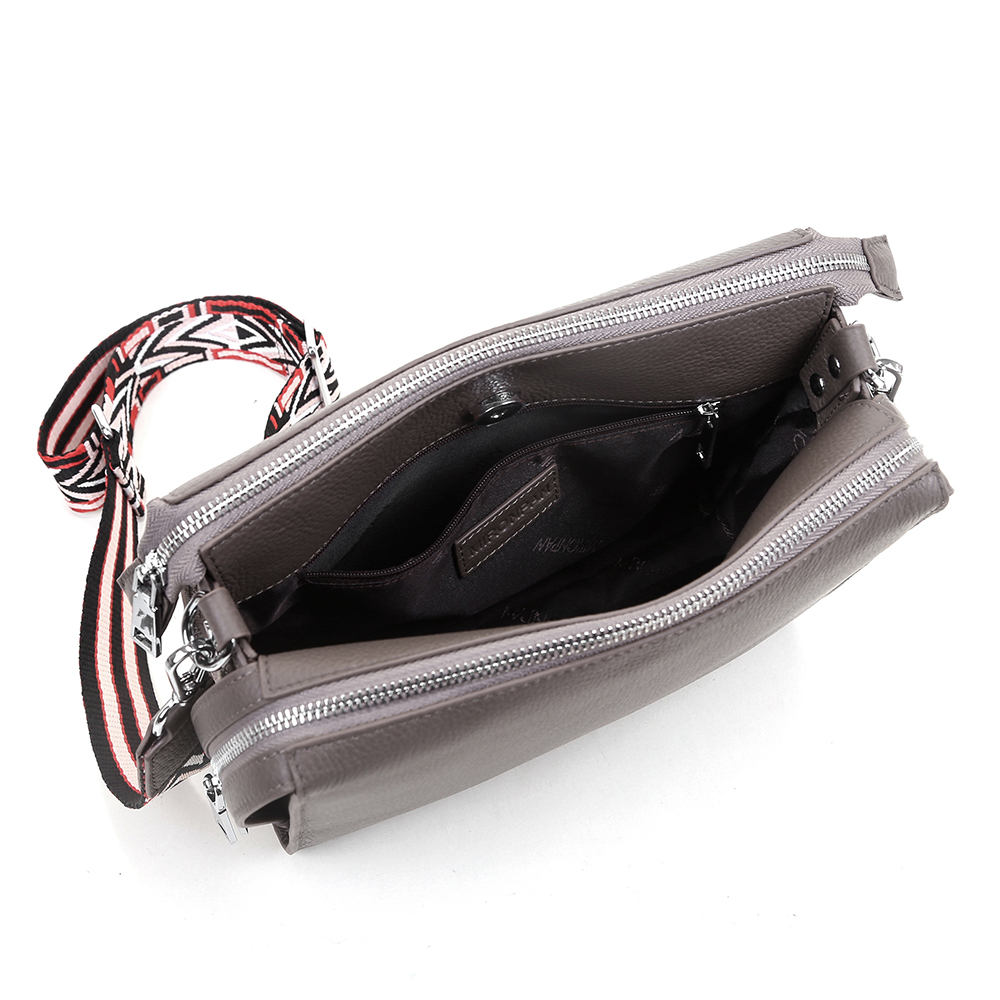 Стильная сумка на плечо MIRONPAN в темно-сером оттенке выполнена из натуральной зернистой кожи. В сумке 3 отделения, 2 закрывается на полукруглую молнию и одно на магнитную кнопку. Внутри одного отделения есть боковой