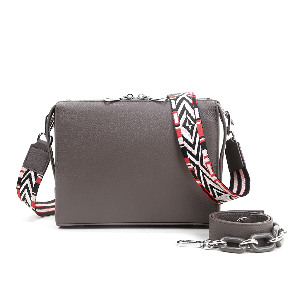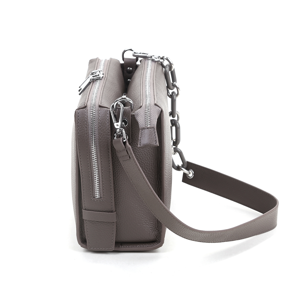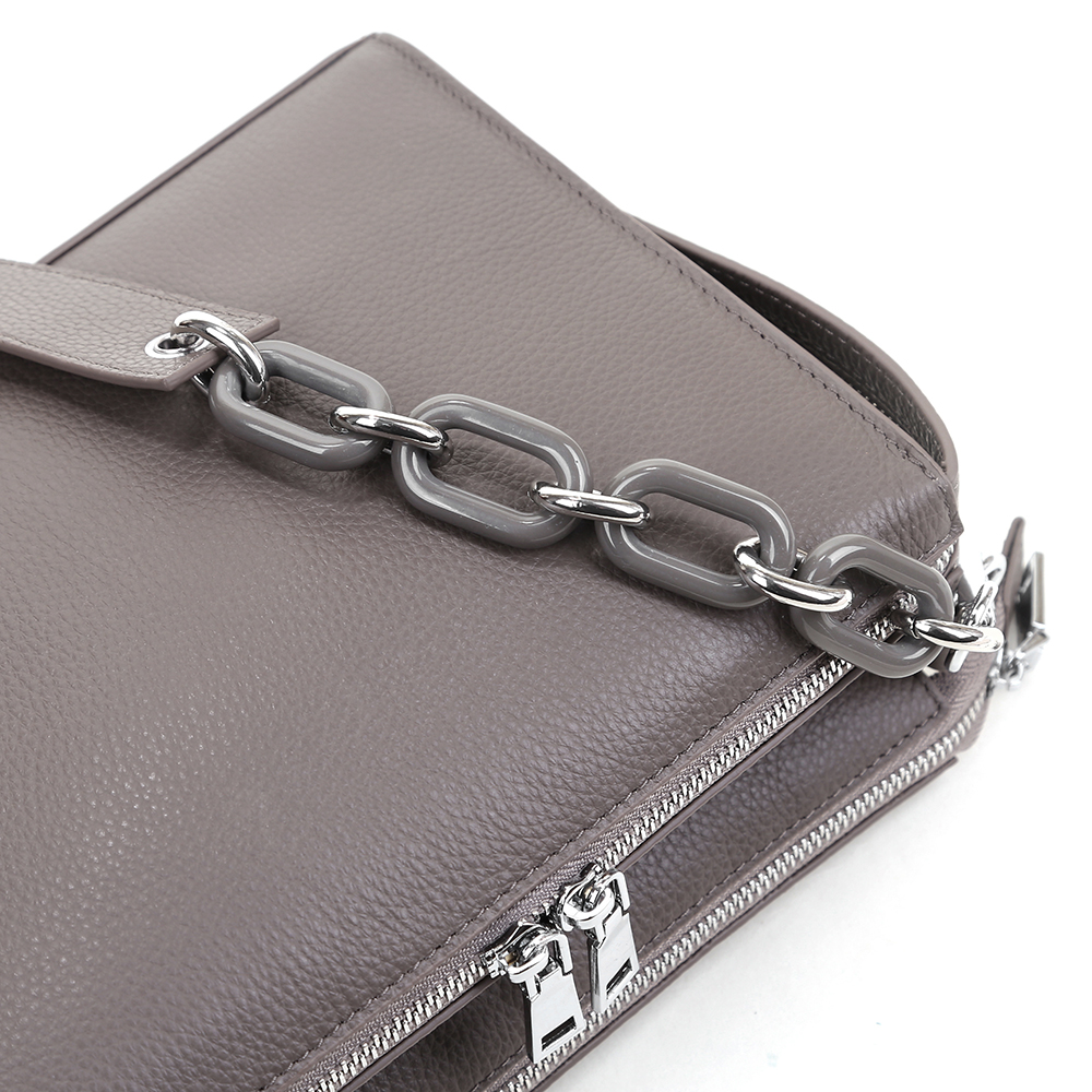 карман для мелочей на молнии. Дно сумки защищают 4 металлические ножки. Удобная кожаная ручка декорирована цепочкой с крупными звеньями ширина - 3см, позволяет носить аксессуар в руке или на плече. В комплект входит съемный тканевый ремень шириной- 4 см.