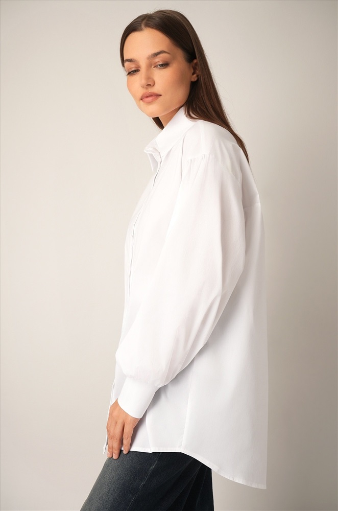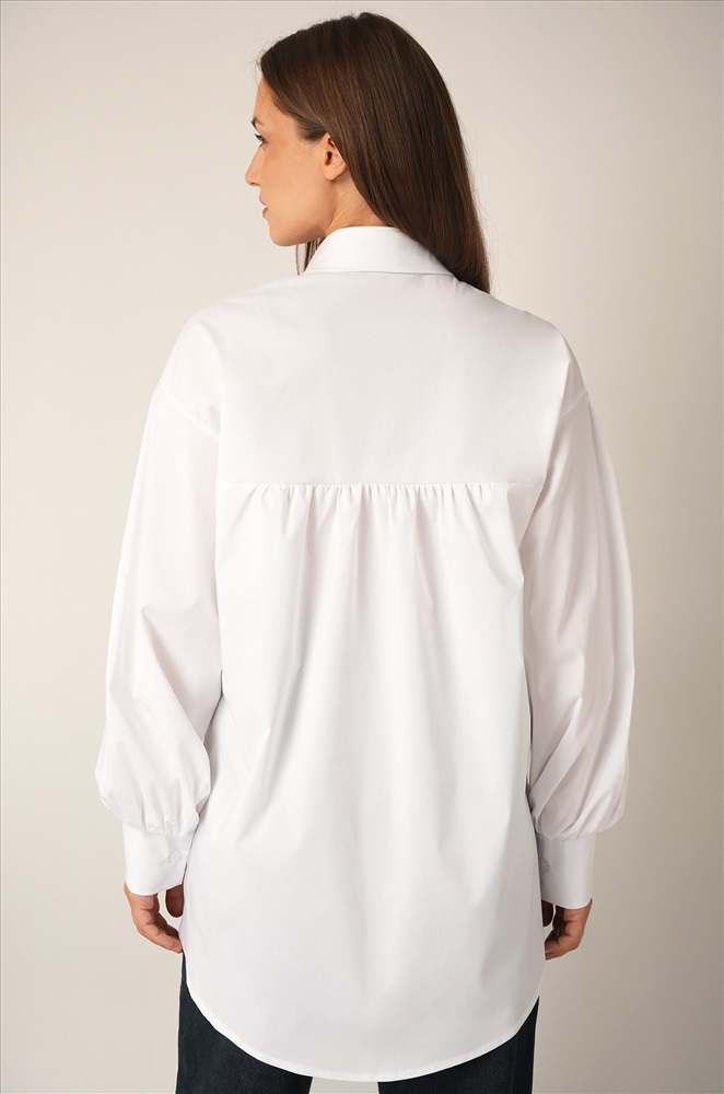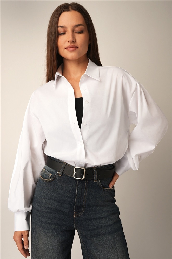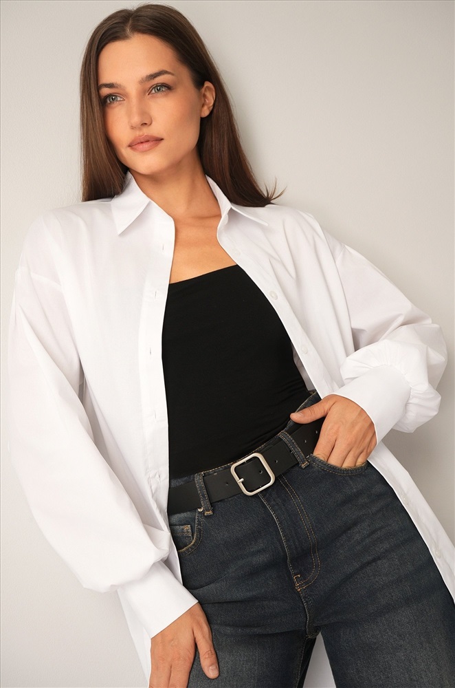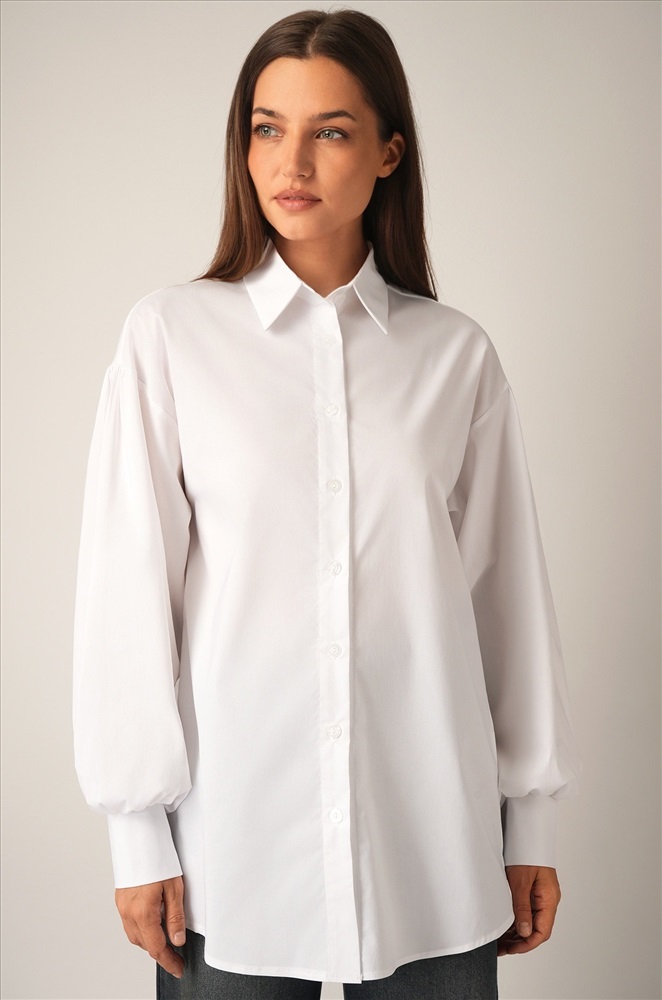 Шикарная женская рубашка оверсайз из натурального 100% хлопка станет стильной базой для любого образа. Объемные рукава-фонарики, удлиненная спинка и отложной воротник добавляют рубашке для женщин нотки нежности и романтики.