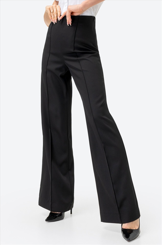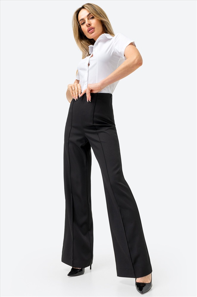 Классические черные брюки с роскошными стрелками привлекут Ваше внимание! Легкие женские брюки выполнены из приятной к телу костюмной ткани с добавлением вискозы и эластана. Удлиненная модель прямого кроя на высокой талии имеет аккуратную застежку сбоку на потайную молнию. Широкие брюки декорированы стрелками спереди и сзади.