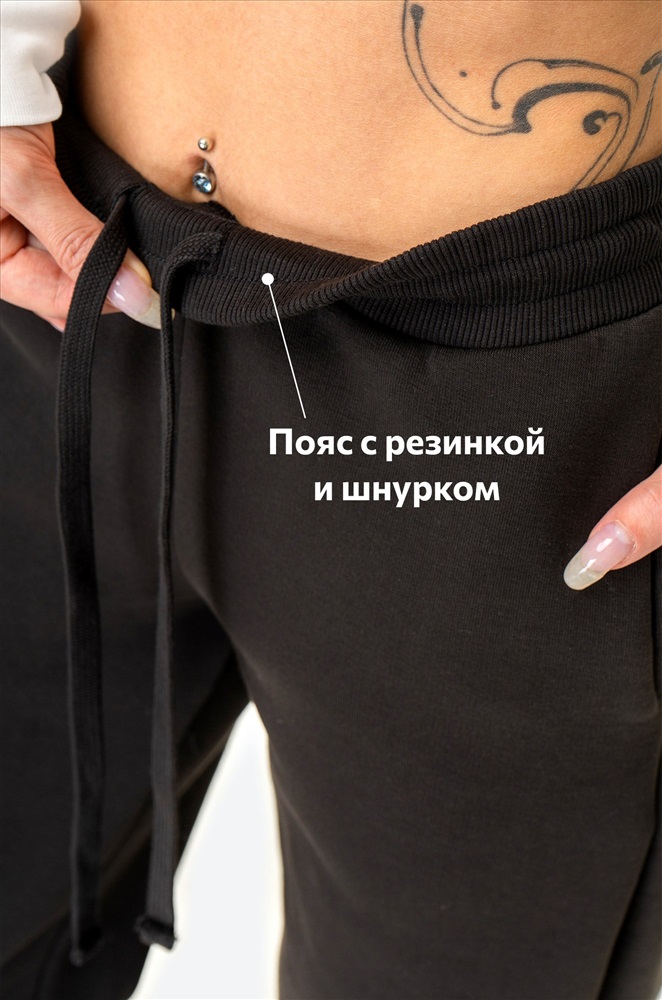 Трикотажные брюки свободного кроя не стесняют движения. Манжеты на резинке не позволят штанинам задираться, эластичный пояс на высокой талии делает посадку комфортной. Пояс изнутри регулируется шнурком.