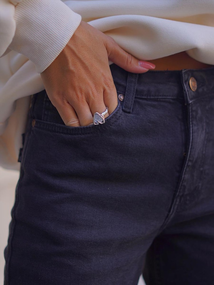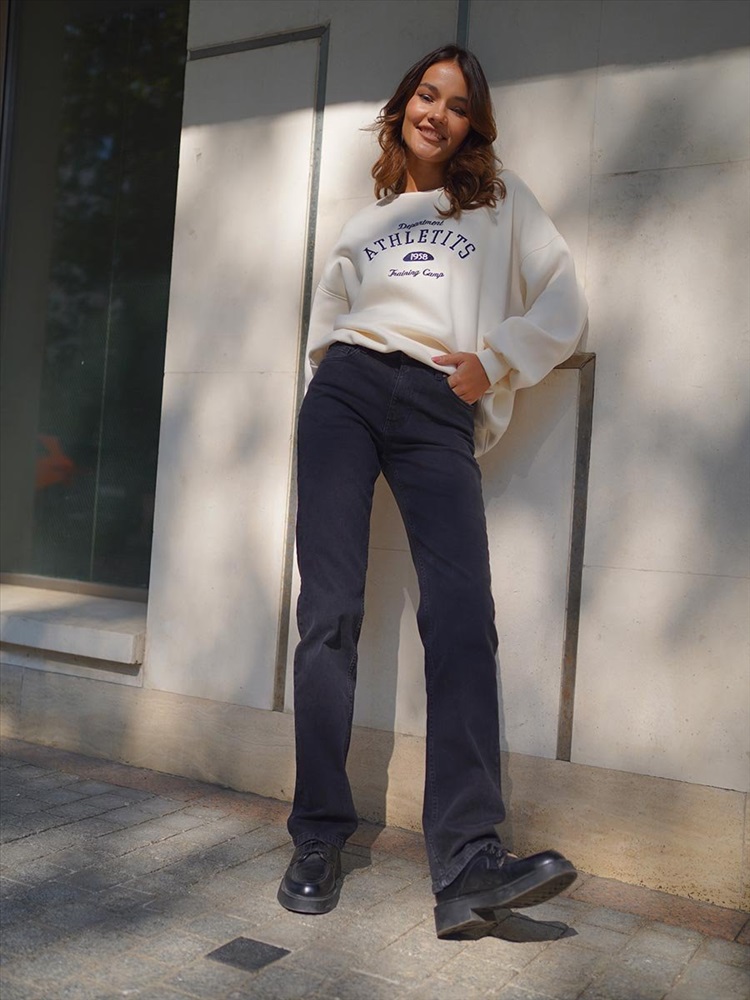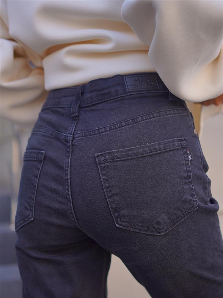 Женские классические джинсы с пятью карманами. Посадка Regular fit (полуоблегающие по бедру). Для улучшения посадки по талии сделан подкройной пояс из 2-х частей. Средняя высота талии спереди и высокая сзади. Застежка на молнии. Немного зауженные к низу. Выполнены из слабоэластичной ткани denim comfort stretch, цвет ткани Black/Black (лицевая и изнаночная стороны ткани черные). Средняя стирка с потертостями спереди и сзади.