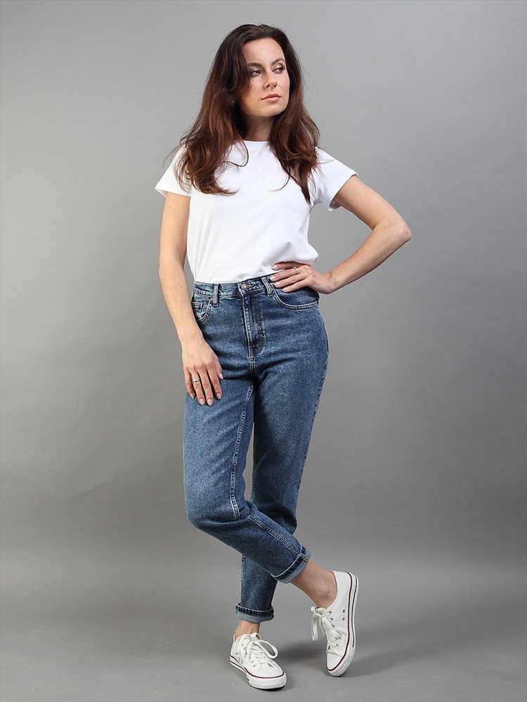 Цвет: стирка средняя; Состав: 99%Хлопок, 1%Эластан; Материал: Blue denim 007 str.; Вес материала: 12.1; Фит: Mom fit; Талия спереди: высокая; Талия сзади: высокая; Ширина колена: 20,5см; Ширина низа: 16см; ID: 133546