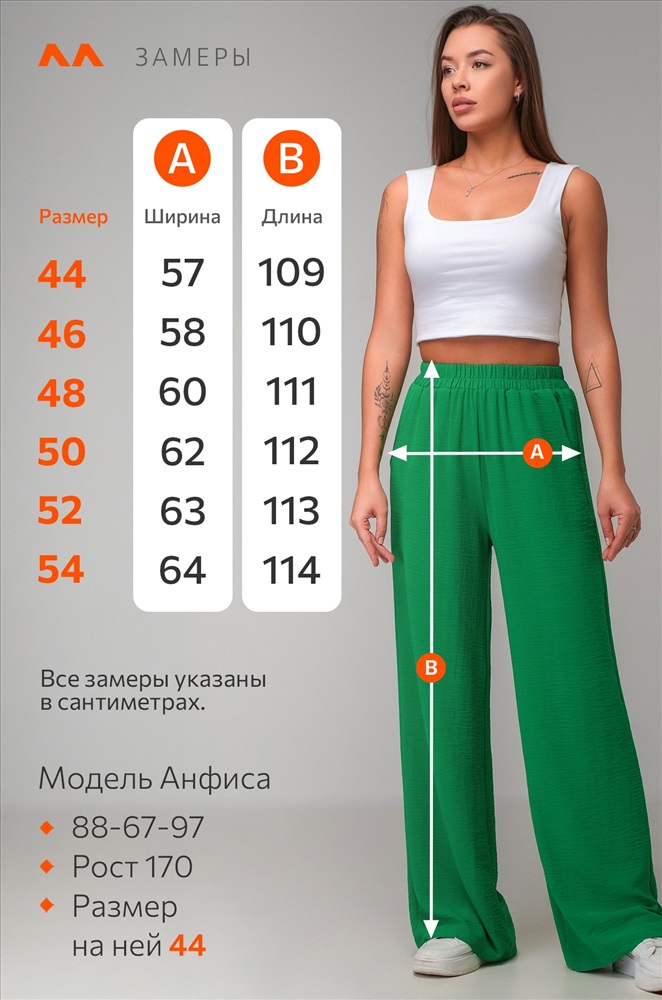 Размер 44: длина внеш.шва:109 см; длина внутр.шва:75 см; ширина по бедрам:57 см.