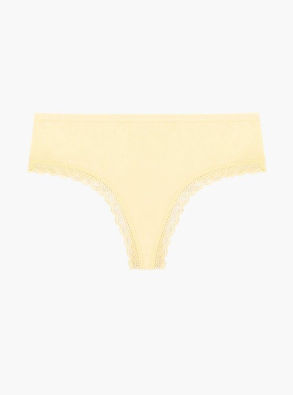 Нежные стринги светло-желтого оттенка из мягкого хлопка, украшенные изящным кружевом. Модель оформлена ажурной окантовкой по контуру и декоративной кружевной вставкой с цветочным узором на задней части.