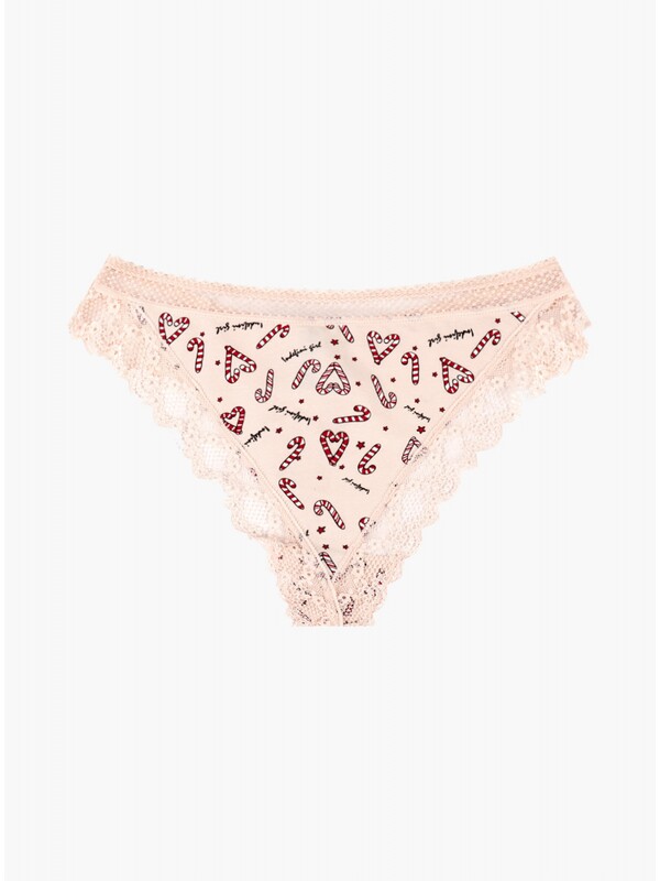 Женские трусы от торговой марки Индефини. Трусы-стринги из хлопка, бежевого цвета, с принтом, с кружевным обрамлением, на мягкой резинке, средней посадки.