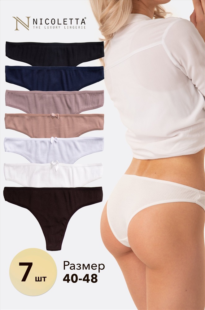 Набор женских трусов бразилиана в рубчик 7 шт. выполнен из хлопкового трикотажа высокого турецкого качества с добавлением эластана. Комплект трусиков из 7 штук представлен в однотонных базовых оттенках.