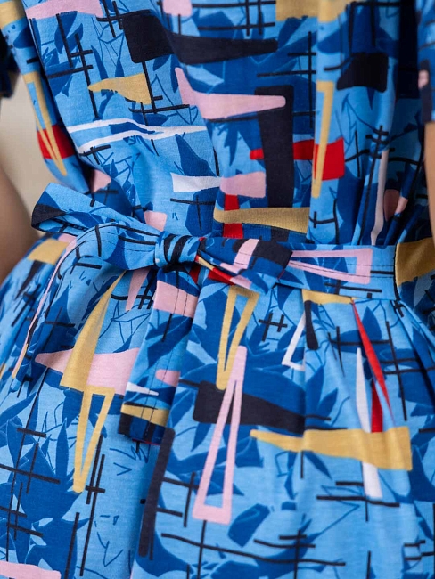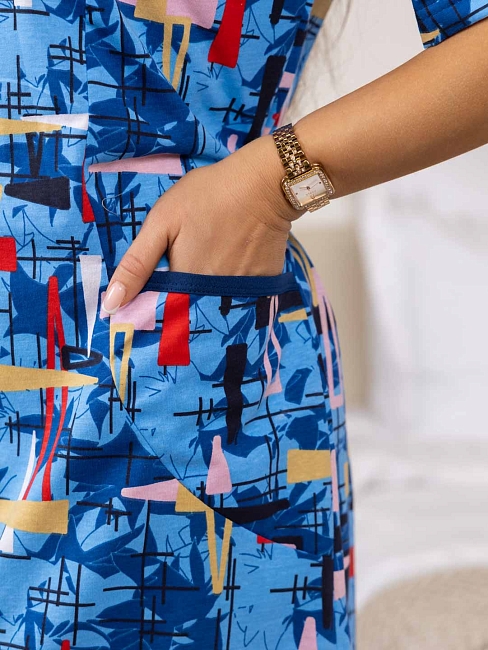 Халат женский из 100% хлопка, полуприлегающего силуэта длиной чуть выше уровня колена. Халат выполнен из яркой ткани, с застежкой на молнию. На полочке присутствуют накладные карманы с отделкой в верхней части. Вырез горловины V-образный, обработанный окантовкой. Идеально подойдет для дома, в нашем халате вы будете чувствовать себя комфортно пока занимаетесь домашними делами.