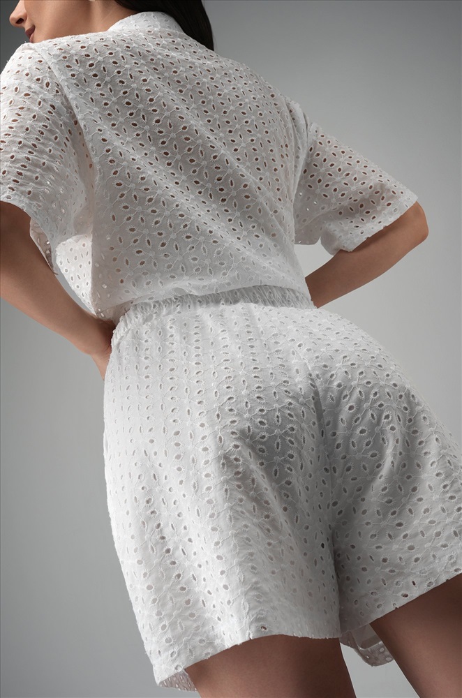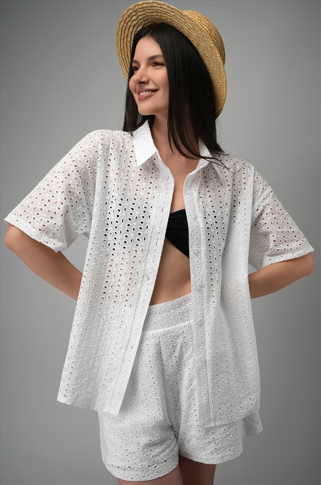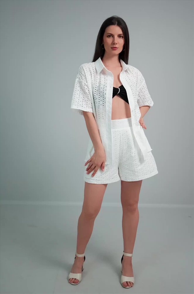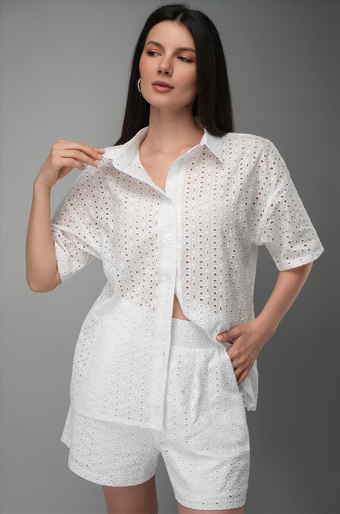 Оригинальный, лёгкий — этот летний женский костюм точно не останется без внимания. Белый цвет, ажурная ткань шитьё и свободный силуэт делают его идеальным для жарких дней и расслабленного отдыха.