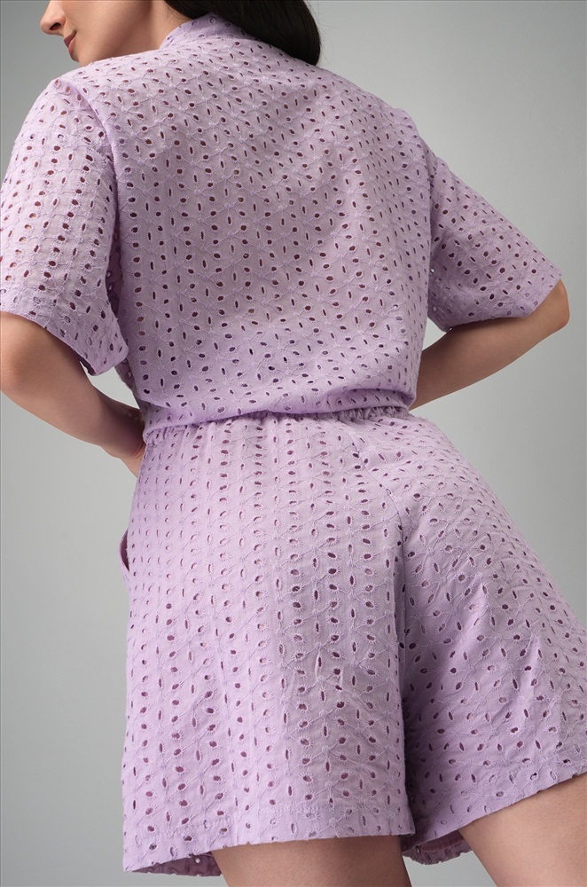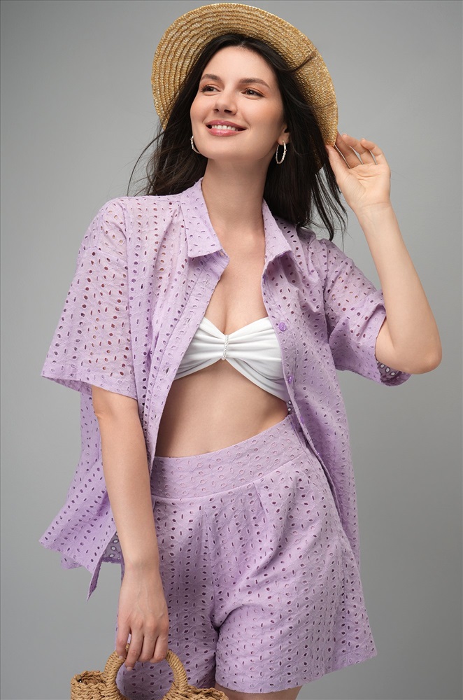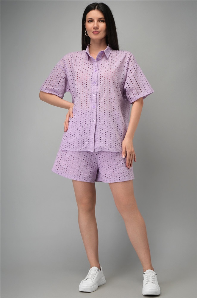 Однотонный костюм цвета лаванды включает рубашку оверсайз с короткими рукавами и отложным воротником и шорты с подкладкой — отличный комплект двойка для женщин. Лёгкий хлопковый вариант подойдёт для прогулок, пляжа и других летних путешествий.