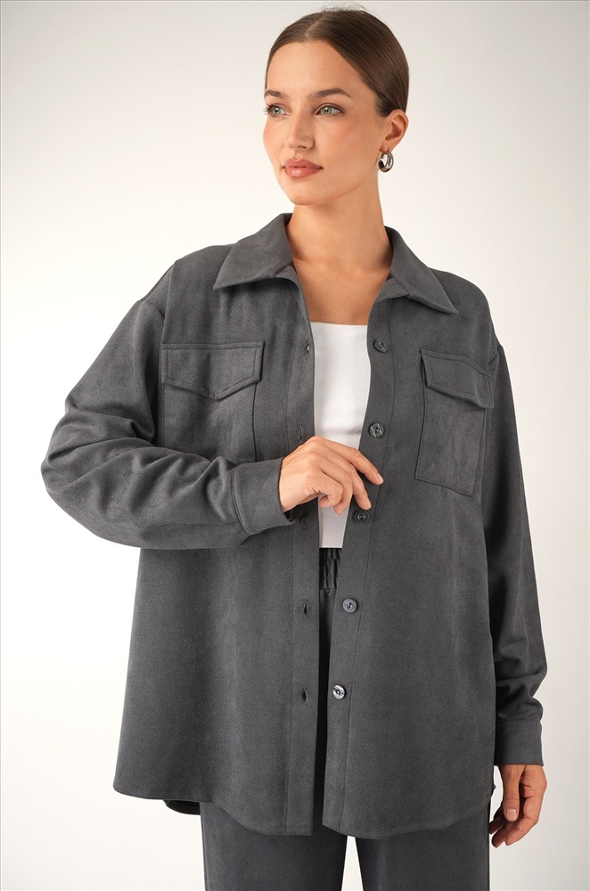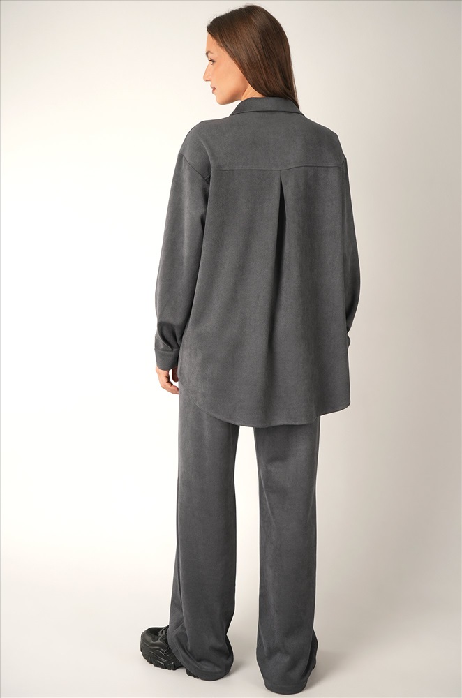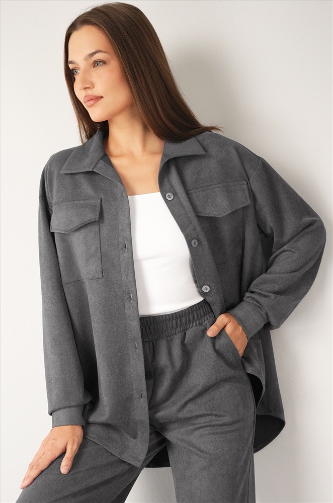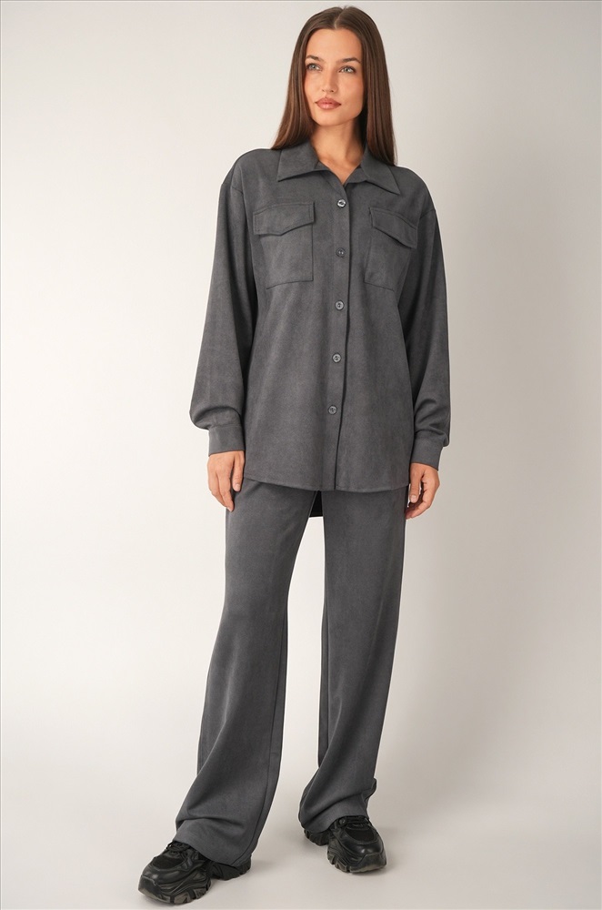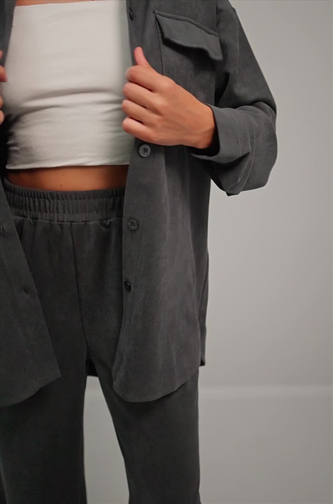 Брюки палаццо на резинке и рубашка оверсайз с нагрудными карманами создают женский комплект, который одинаково уместен для девушек и женщин и в офисе, и на прогулке. Темно-серый вельветовый костюм будет незаменим как базовый, даря комфорт в осенний или весенний сезон.