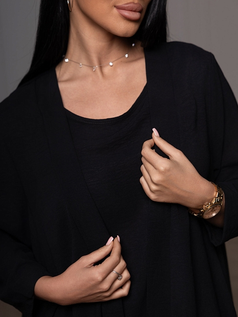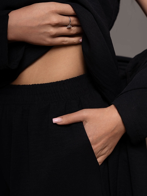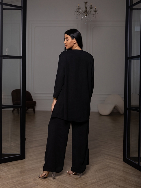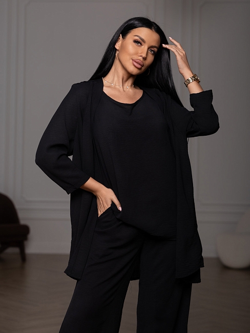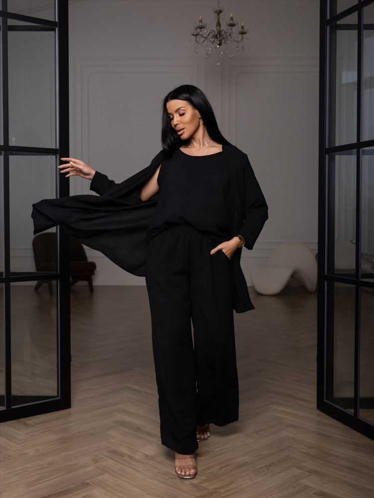 Летний женский костюм-тройка: стильное кимоно, майка и свободные брюки. Майка без рукавов, с О-образной горловиной, длиной до середины бедра. Накидка-кимоно с втачным рукавом длиной 3/4. Брюки палаццо с карманами в боковых швах и поясом с эластичной резинкой и отстрочкой на поясной машине.