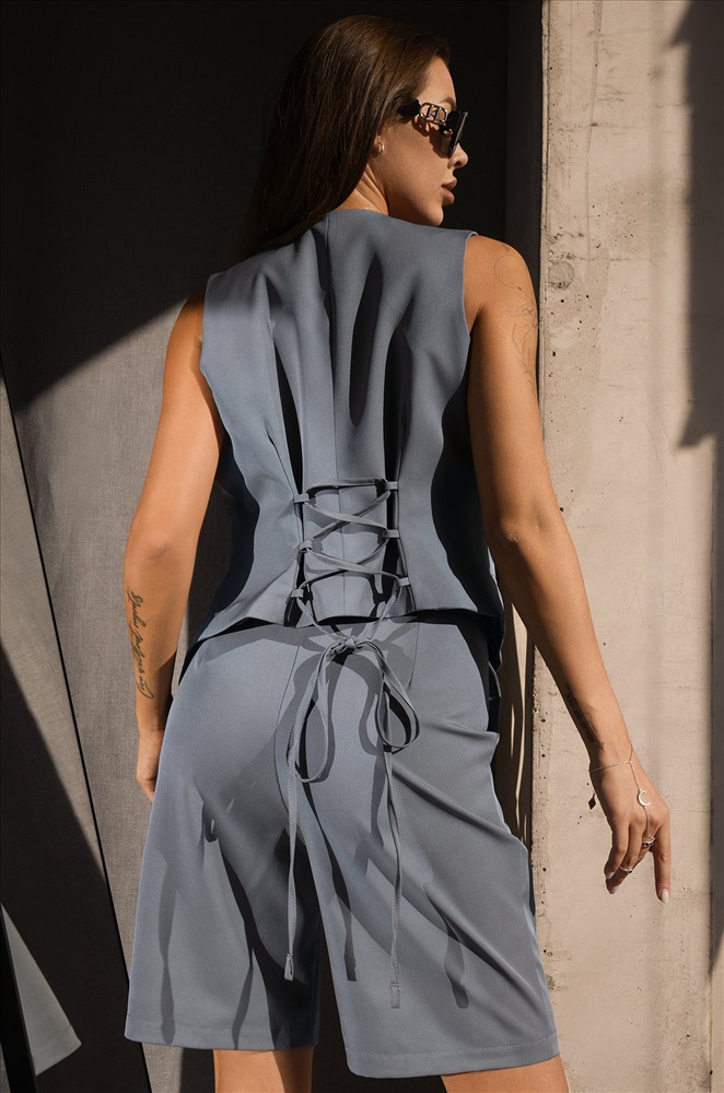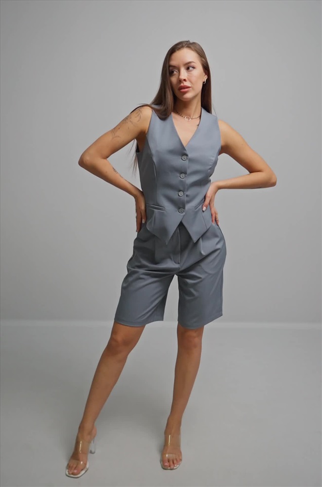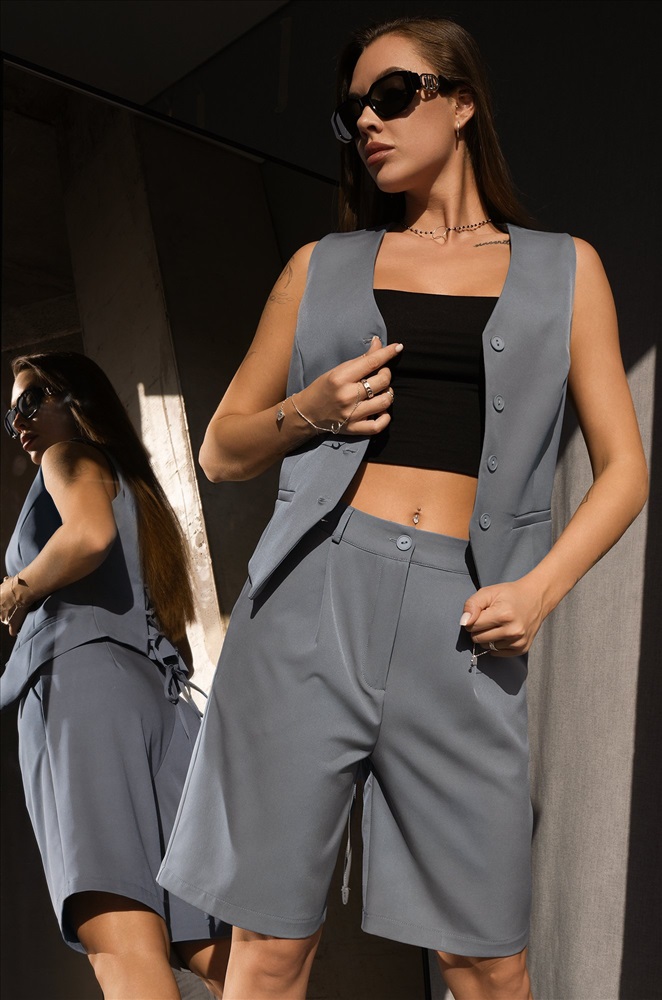 Шорты бермуды прямого кроя дополнены защипами на поясе и удобными карманами, благодаря чему образ выглядит аккуратным и продуманным. Классический приталенный жилет с V-образным вырезом застёгивается на пуговицы в тон ткани, имеет декоративные карманы-обманки и шнуровку по спинке для идеальной посадки по фигуре. Жилетка с подкладкой добавляет образу завершённости и аккуратности. Безрукавка остаётся лёгкой, но форменной — отличный баланс между строгостью и лёгкостью.