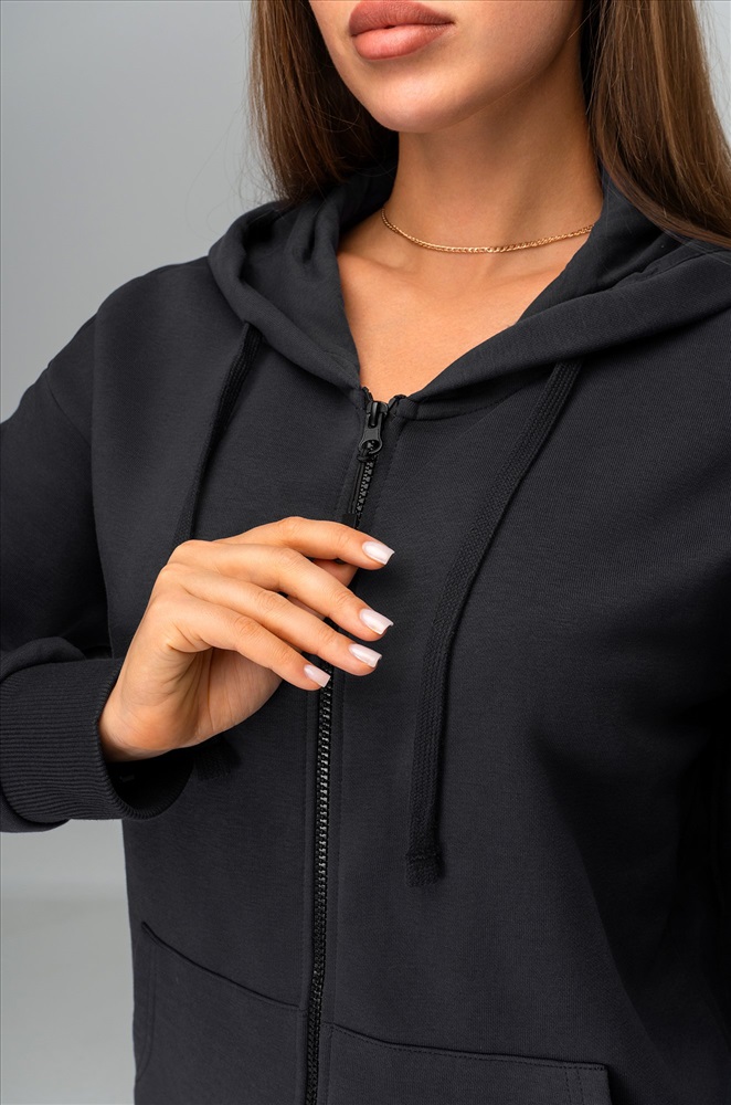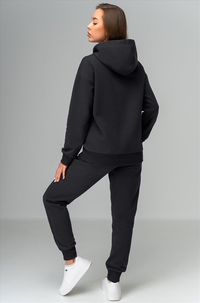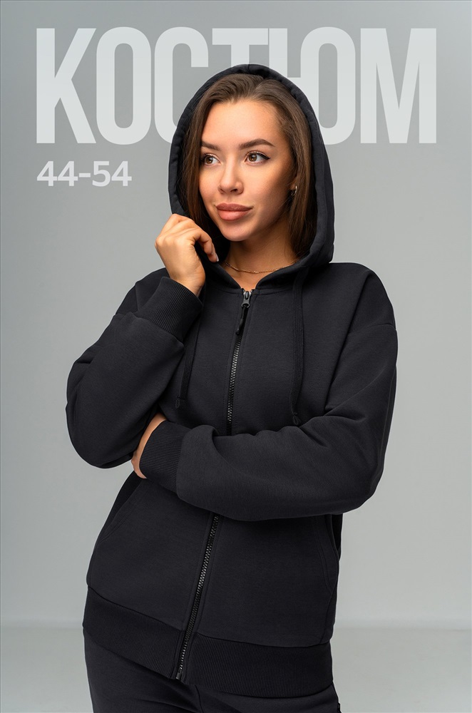 Женский спортивный костюм станет надежным спутником на тренировках и в повседневной жизни. Однотонный черный костюм состоит из толстовки зипки с длинным рукавом и брюк. Трикотажный костюм двойка выполнен из плотного, но мягкого футера трехнитки.