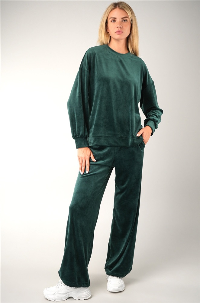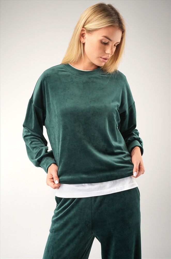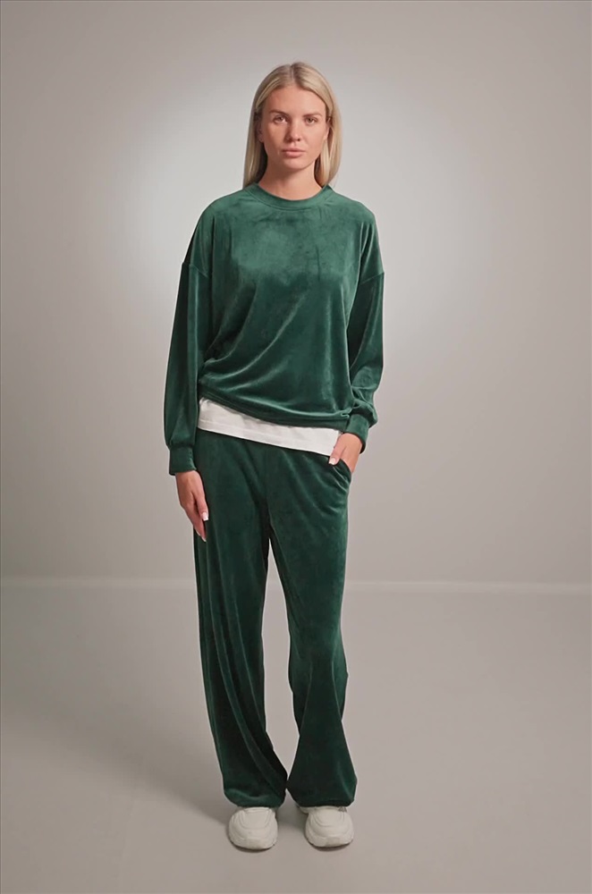Женский костюм из мягкого велюра изумрудного цвета — идеальный выбор для тех, кто ценит комфорт и стиль. Однотонный костюм двойка согреет в прохладные дни осени и весны, а лаконичный дизайн подчеркнёт уверенность и вкус.