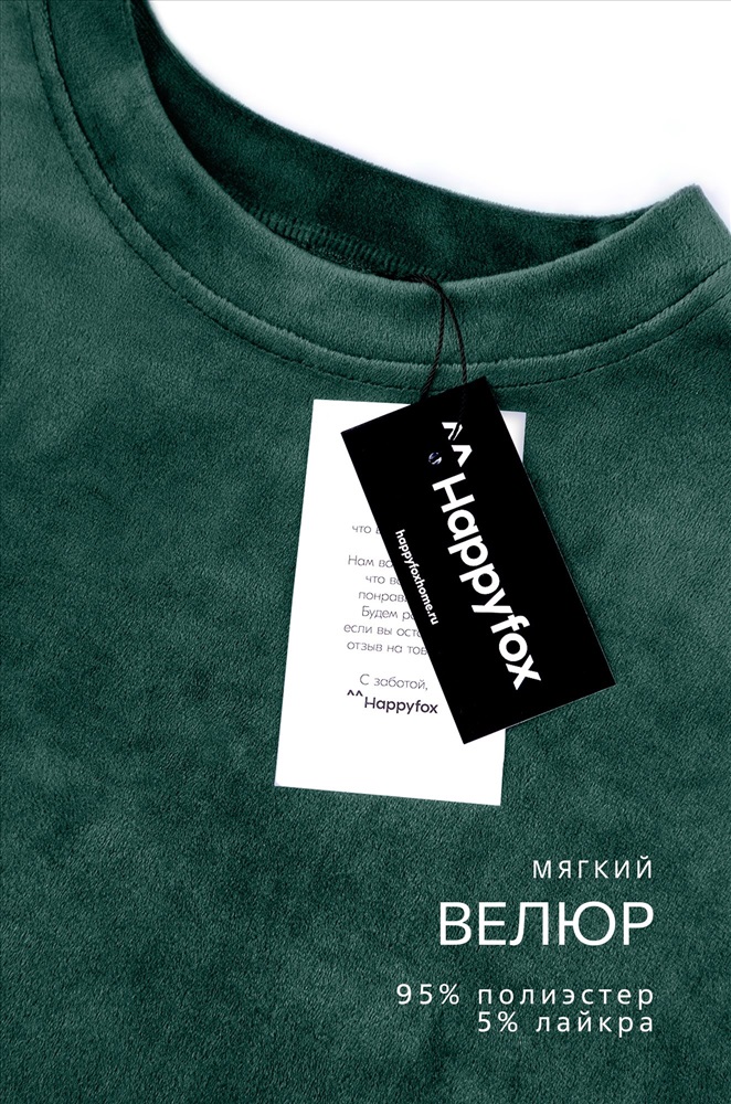 Производитель: Happyfox; Бренд: Happyfox; Страна: Россия; Состав: 95% полиэстер, 5% лайкра; Материал: Велюр; Плотность ткани: 250 г/м2; Цвет: изумруд