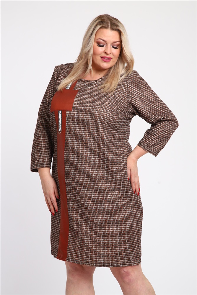 Женское платье прямого силуэта сшито из высококачественной ткани Сандра, известной своей мягкостью и прочностью. Ткань обеспечивает легкость в уходе и долговечность изделия. Вставка из стрейч-кожи на полочке это стильное дополнение, придающее изделию современный вид. Кожа не только акцентирует внимание на платье, но и добавляет оригинальности в общий дизайн.