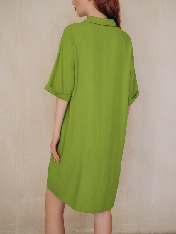 Выполнено в зеленом цвете. Платье с короткими рукавами и отложным воротником застёгивается на пуговицы и имеет нагрудный карман. Платье свободного прямого кроя. 85% Вискоза 12% Лён 3% Хлопок Комментарии к товару