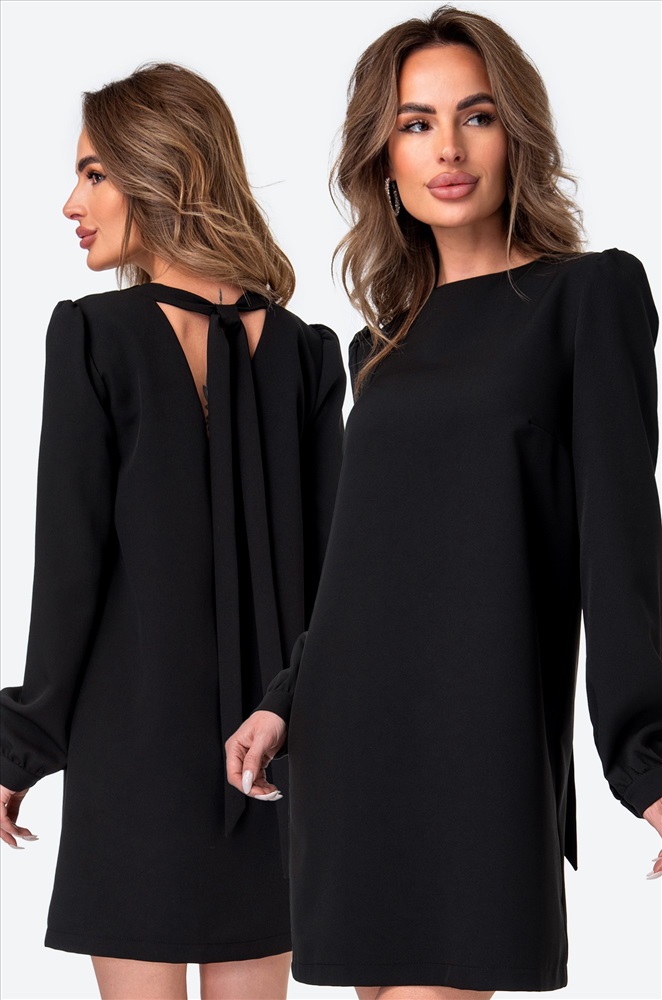 Женское платье свободного фасона, не обтягивает, но выгодно подчеркивает женскую фигуру. Прямой вырез горловины мягко переходит в линию плеча и заканчивается фонариком. По низу длинный рукав собран на манжету. Милая изюминка – шикарный вырез на спинке. Длинные завязки можно оформить как в красивый бант, так и просто перевязать между собой.