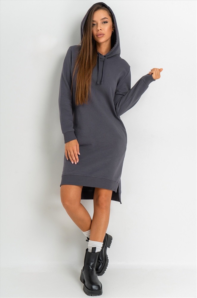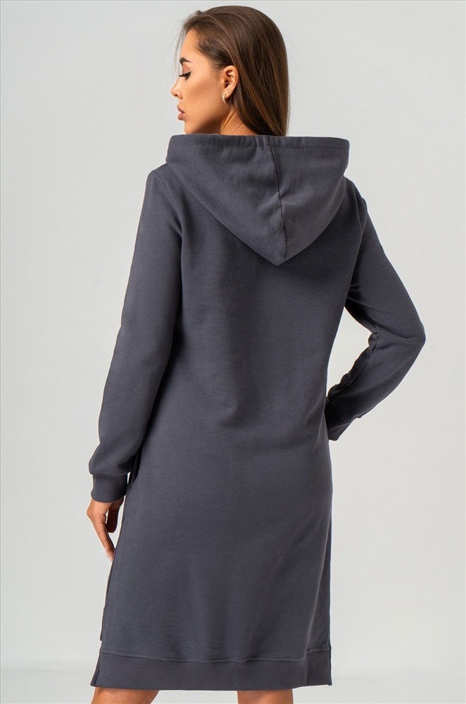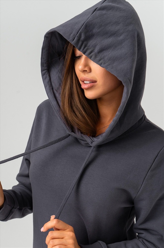 Серое платье-худи выполнено из футера трехнитки — натуральный хлопок в составе дарит мягкость и комфорт, а добавление полиэстера сохраняет форму и делает трикотажное платье устойчивым к износу.