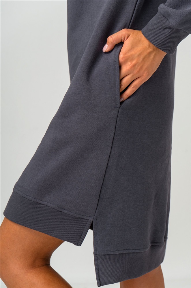 Удлиненная спинка, прямой крой и длина мини создают непринужденный силуэт, позволяя двигаться свободно. Длинные рукава подчеркивают спортивный стиль, а графитовый цвет делает однотонное платье универсальным.