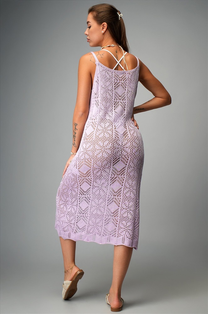 Удлиненная пляжная туника подойдет женщинам, которые ценят сочетание удобства и красоты. Однотонный вязаный сарафан лавандового цвета – незаменимый выбор для прогулок, встреч с друзьями или отдыха у моря.