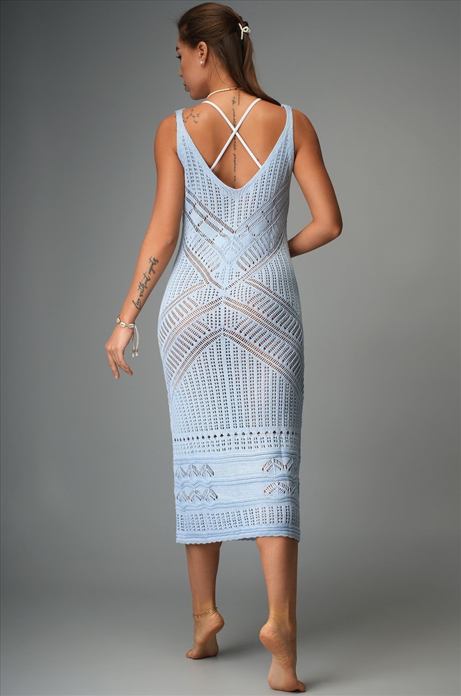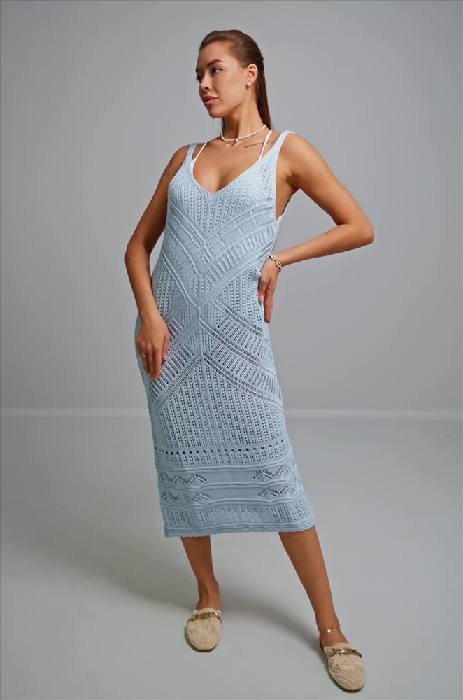 Прямой крой и длина миди делают голубое платье стильным и элегантным, а V-вырез спереди и сзади привносят в образ динамичность и привлекательность. Открытая спинка создает идеальный внешний вид для пляжа.