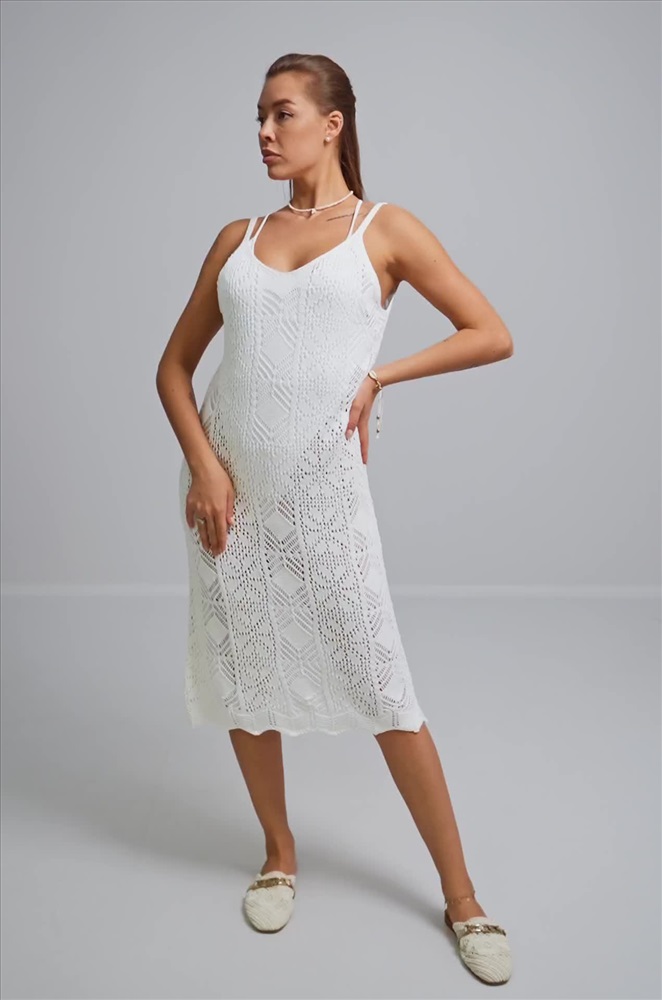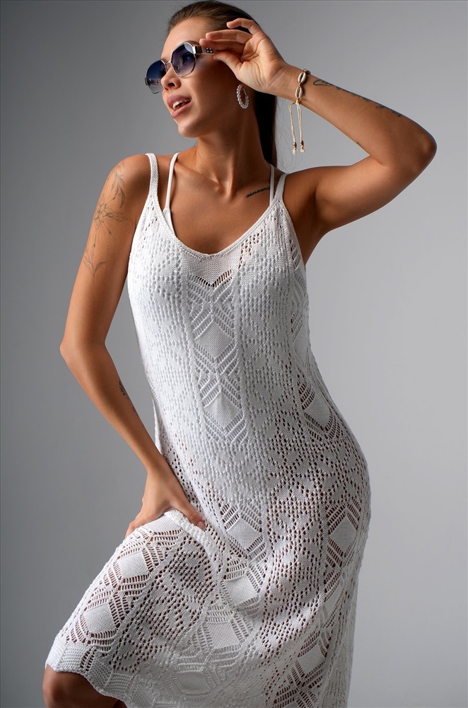 Вязаное платье миди создано для легкости и вдохновения. Ажурная вязка придает образу невесомость, а свободный крой делает модель универсальной. Длинное женское платье станет идеальным выбором для пляжа.