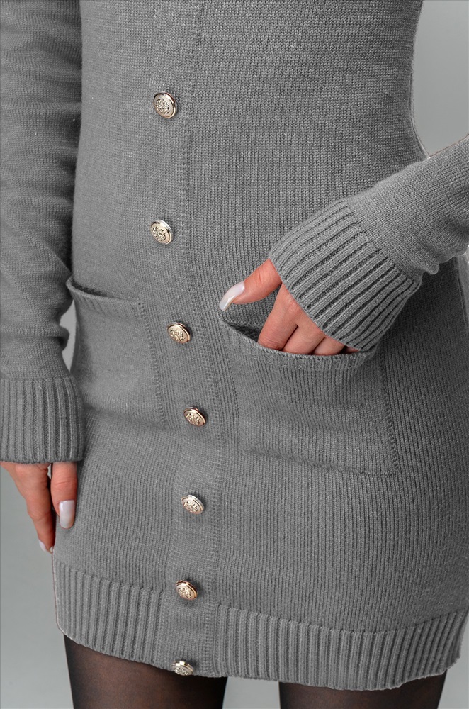 Главной изюминкой наряда является планка на золотые пуговицы, проходящая по всей длине платья, добавляя ему роскошный и праздничный вид. Практичные карманы не только удобны, но и создают стильный акцент.