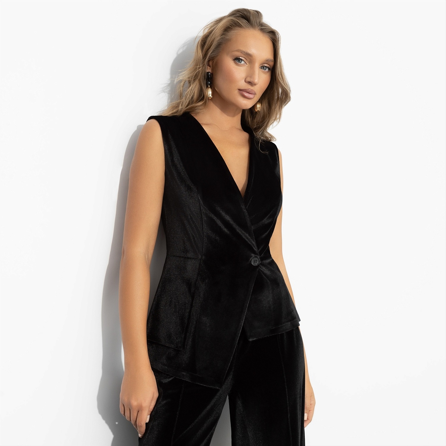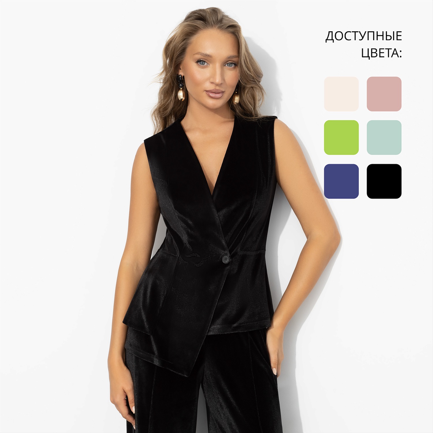 ТН ВЭД: 6211490009; Состав: «Бархат-стрейч» (95% п/э, 5% спандекс); Плотность ткани: Средняя; Тип ткани: Текстиль; Вид застежки: Пуговица/-ы; Карманы: Нет; Основной цвет ткани: Черный; Отрезная талия: Нет; Подклад: Нет; Резинка по талии: Нет; Рисунок/раппорт: Нет, все изделия идентичны; Сезон: Круглогодичный; Силуэт: Приталенный; Стиль: Классический