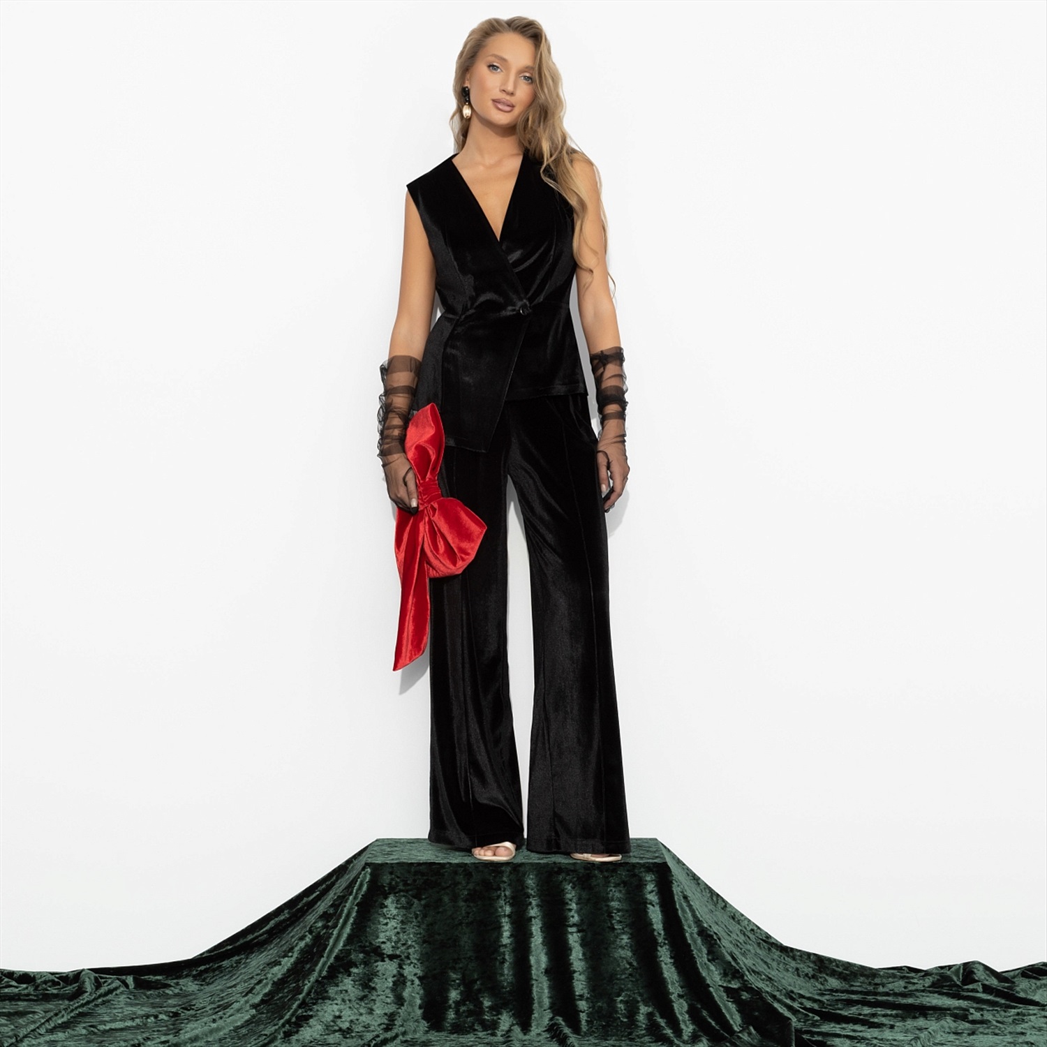Бархатный жилет создан для женщины-кошки – той, что движется мягко, но уверенно, оставляя за собой след внимания и восхищения. Бархат мерцает при каждом шаге, подчёркивая изгибы и силу. Она не кричит о своей власти – она ею дышит. Этот образ манит, обещает и покоряет. Жилет асимметричного кроя с эффектом многослойности. Глубокий вырез и акцент на талии делают силуэт выразительным и утончённым.