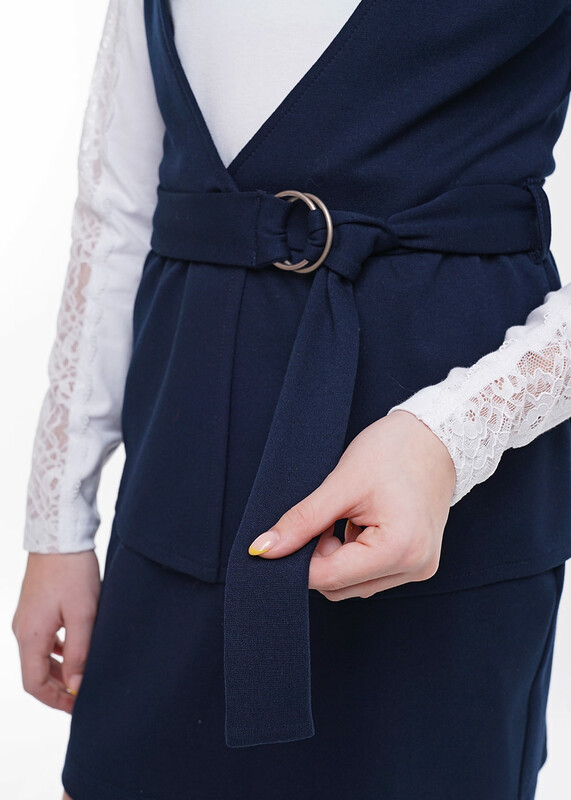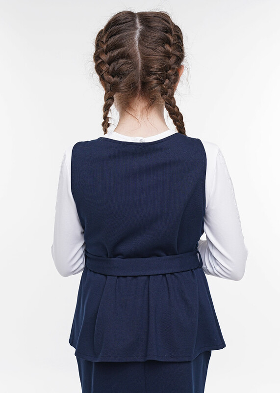 Жилет из джерси полуприлегающего силуэта, имеет английский воротник. Аккуратная баска гармонирует с вырезом горловины. Модель подходит для девочек с разными типами фигур. По линии втачивания баски, дополнена поясом на кольцах и этой же ткани.