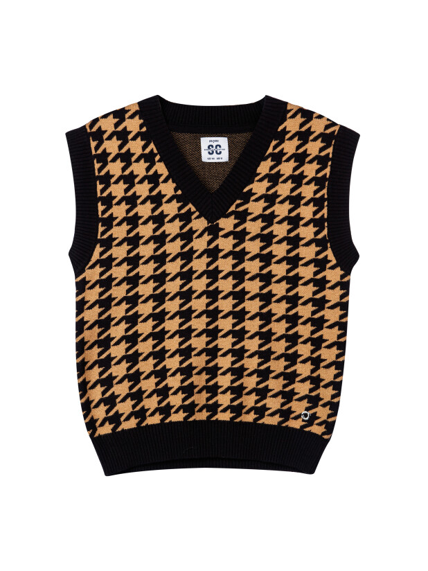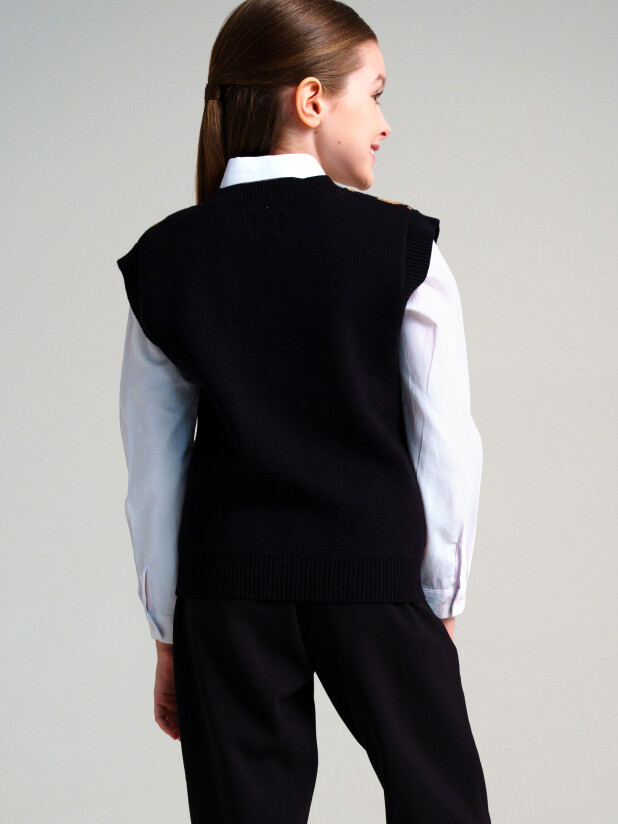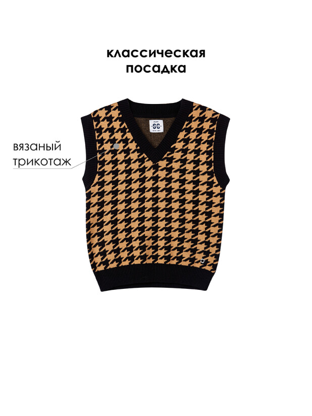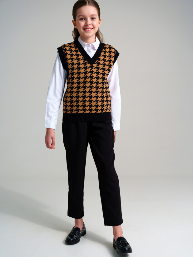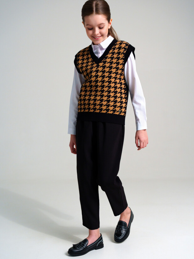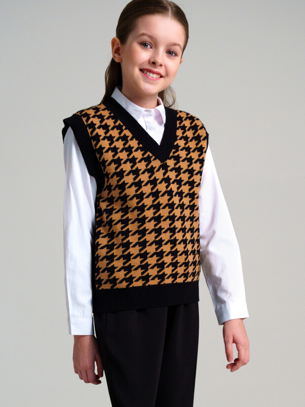Классический школьный жилет для девочки подростка. Жилет прямого силуэта выполнен из вязаного трикотажа с высоким содержанием вискозы, что обеспечивает максимальный комфорт для школьницы во время занятий. Жилетка в школу выглядит стильно, благодаря трендовому рисунку "гусиная лапка". Рубашка, футболка или поло + жилет для школьницы составит красивый элегантный комплект для школы.
