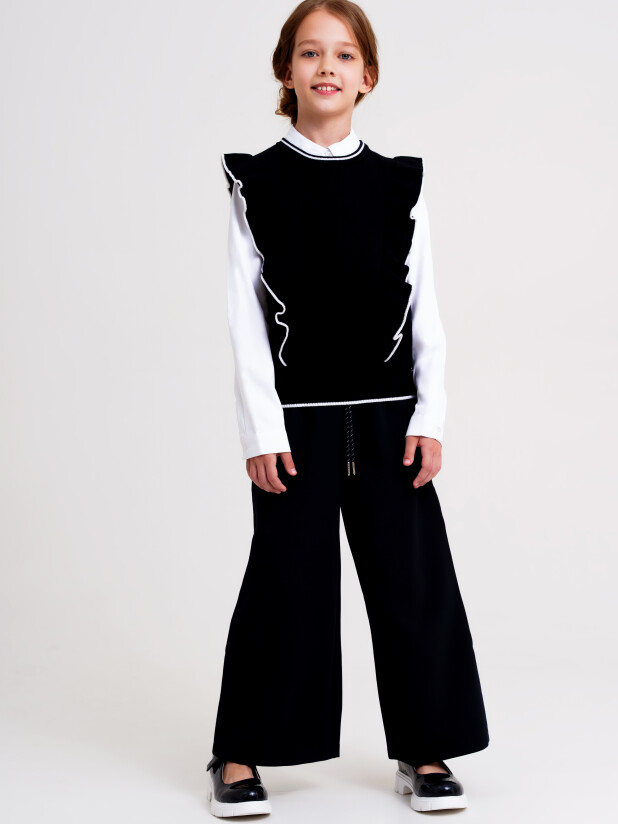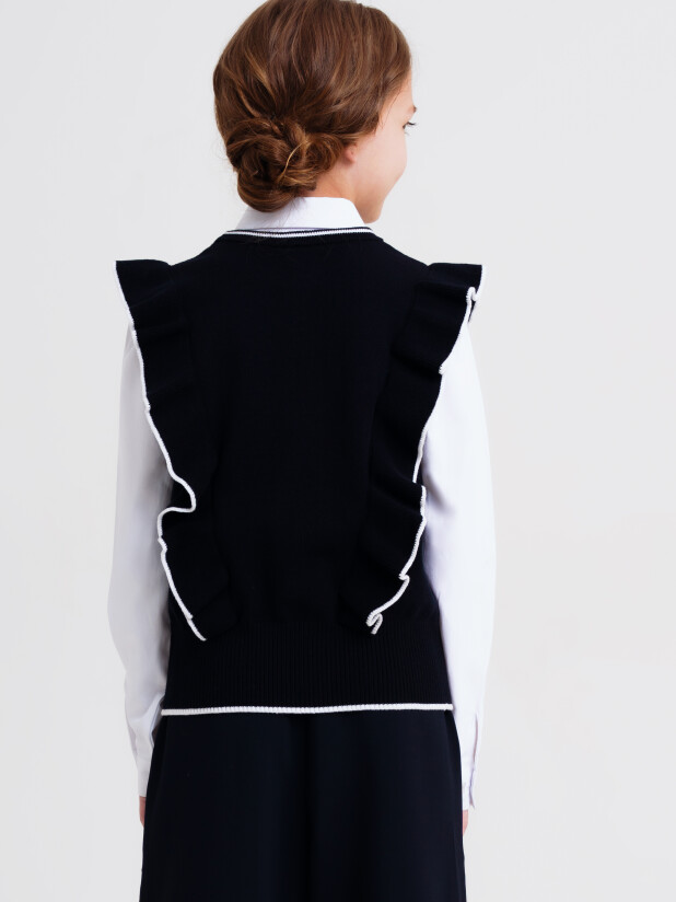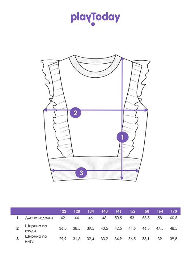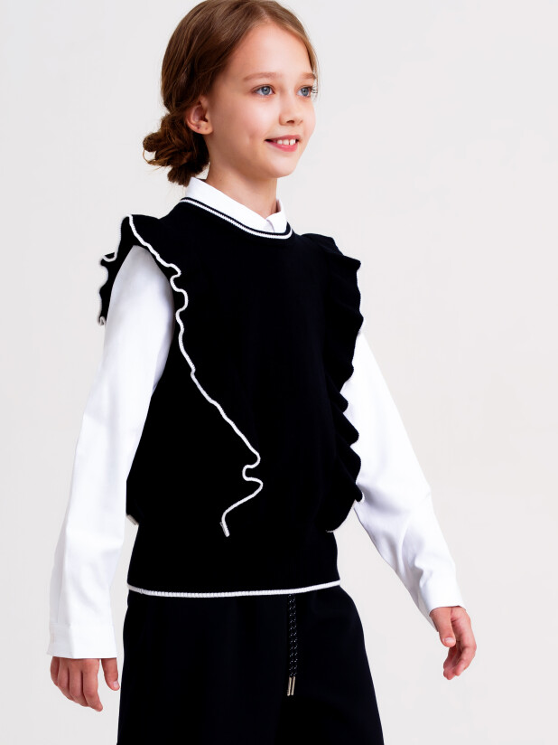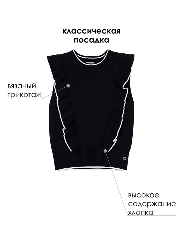 О товаре Классический темно-синий школьный вязаный жилет для девочки подростка от PlayToday — стильная и комфортная деталь школьного гардероба, созданная для особых, запоминающихся образов. Прямой силуэт, мягкий вязаный трикотаж с высоким содержанием хлопка и нежный декор из рюш делают эту стильную трикотажную жилетку в школу не только удобной, но и по-настоящему нарядной. Преимущества модели: + вязаный трикотаж с высоким содержанием хлопка + прямой крой + декор из рюш + универсальный темно-синий цвет + лёгкий уход Этот синий подростковый жилет для школы мягко садится по фигуре, не сковывает движений и обеспечивает комфорт на весь учебный день. Благодаря прямому силуэту модель легко надевается поверх рубашки, футболки или поло — получится элегантный и современный комплект для школы, в котором школьница всегда будет чувствовать себя уверенно. Декор из рюш добавляет нежности и индивидуальности, делая детскую жилетку для девочек особенной для школьных мероприятий или праздничных дней. Сдержанный синий цвет гармонично сочетается с юбками, брюками и сарафанами из коллекции PlayToday. Совет по стилю: сочетайте такой универсальный синий жилет для подростков с классической белой рубашкой и юбкой для строгого школьного образа или добавьте футболку для более повседневного варианта. Нарядный вязаный жилет легко стирается, быстро сохнет и сохраняет форму даже после множества стирок. Модель представлена в размерах на рост 122–152 см — отличный выбор для девочек и подростков от 7 до 12 лет. Модный синий трикотажный жилет с рюшами в школу для девочки от PlayToday — это комфорт, нежность и стиль на каждый день! СОСТАВ 82% хлопок, 18% нейлон Уход Ручная стирка. Максимальная температура стирки 30°С. Не отбеливать. Утюжить запрещено. Чистка запрещена. Не применять сушку в барабане. Горизонтальная сушка на плоскости в расправленном состоянии. Стирать с вещами такой же окраски. Бренд PlayToday АРТИКУЛ 22427111 Цвет Темно-синий Возрастная категория Школьники, Подростки Пол Женский Сезон Демисезон Год коллекции 2025 Страна бренда Германия Страна производства Китай Возраст 8 лет, 9 лет, 10 лет, 11 лет, 12 лет, 13 лет, 14 лет, 15 лет, 16 лет Маркировка Товары легкой промышленности и одежда Миниколлекция School