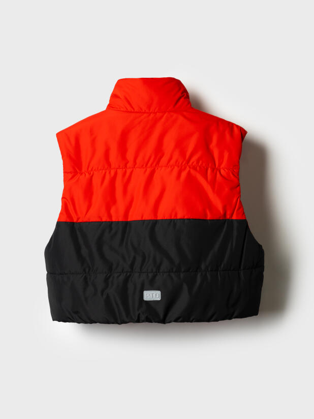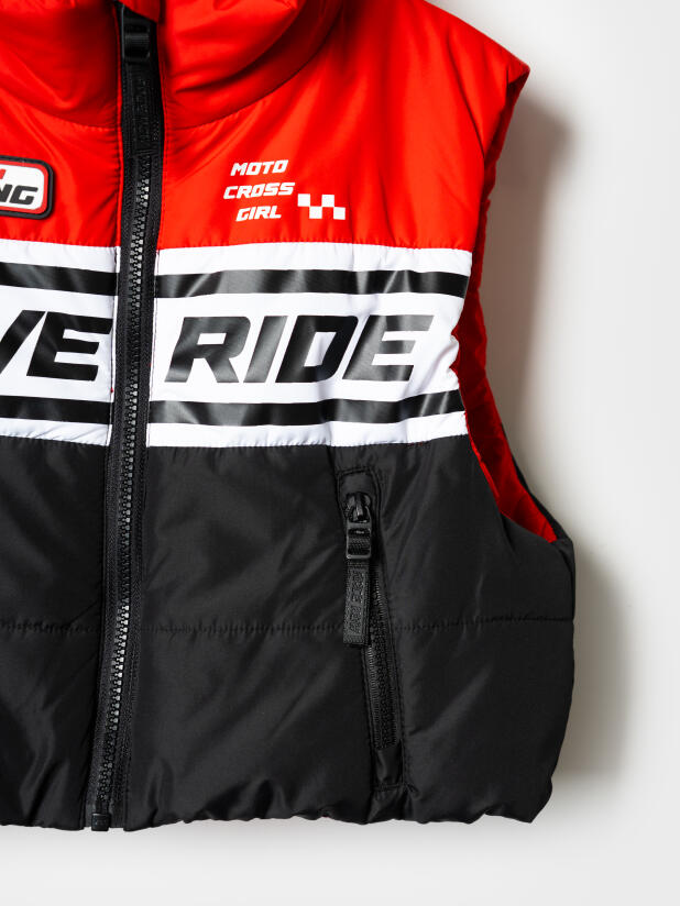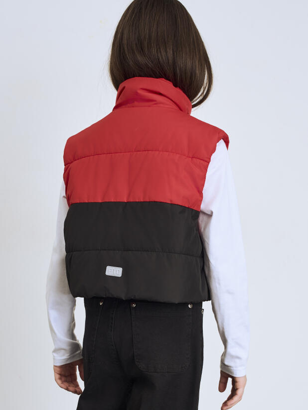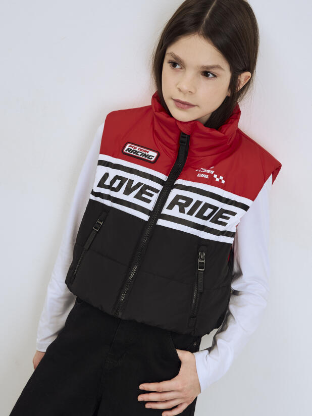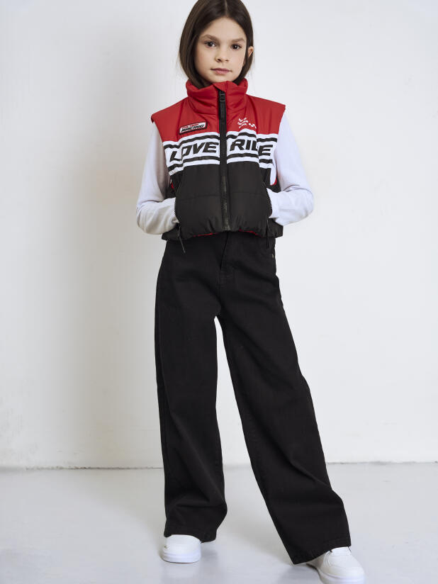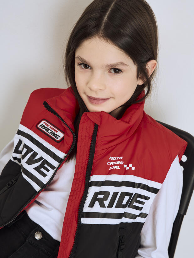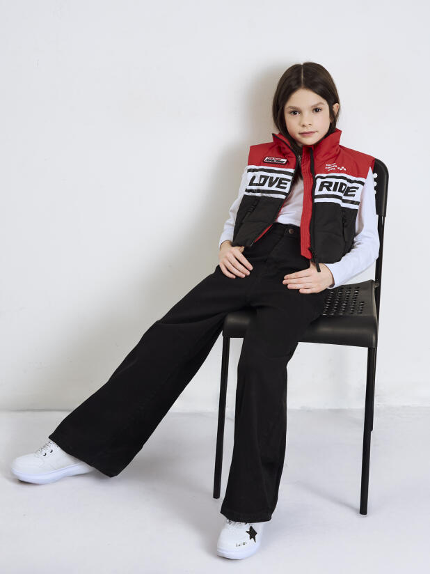 Жилет в спортивном стиле для девочки подростка. Температурный режим от +15 до 0С. Ткань с ветрозащитным и водоотталкивающим покрытием. Внутри гладкая подкладка. По бокам расположены карманы на молнии. Низ изделия на резинке. На спинке — светоотражающая этикетка.